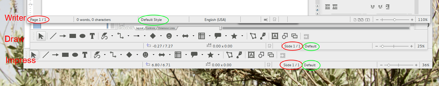 Visual comparison of Writer, Impress, and Draw's status bars.