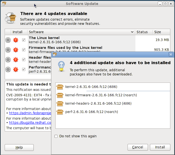 Created attachment 31954 [details] additional updates gpk applet popped up w/ 4 new security updates, so I opened gpk-u-v, reviewed and pressed Install (or whatever) but warning window popped up saying "4 additional update also have to be installed" as seen in the picture. The weird here is that the four "additional update"s are the one from gpk-u-i, which I reviewed as OK already.
