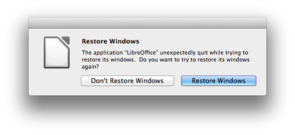 Created attachment 48824 [details] Restore Windows dialog I recently had a computer crash while LibreOffice was open (the cause of the kernel panic was unrelated to LibreOffice). Since then, when I open LibreOffice or a document, I get the "Restore Windows" dialog (see attachment). No matter whether I click on "Don't restore Windows" or "Restore Windows" the dialog stays in front, I can't dismiss it, clicking on the buttons doesn't do anything. The effects of this bug are: • Impossible to open a document from the finder. The "Restore Windows" dialog pops up first and then the Libroffice welcome screen appears in the background. The only way is to open it from the File menu. • Impossible to quit LibreOffice from the dock or the menu. Force quit is the only way. • Deleting LibreOffice from Applications and installing it again doesn't help. The "Restore Windows" is still there when launching LibreOffice. • The dialog stays in front no matter what, I have to hide the dialog manually. If this helps, I'm running Mac OSX 10.7 (GM).