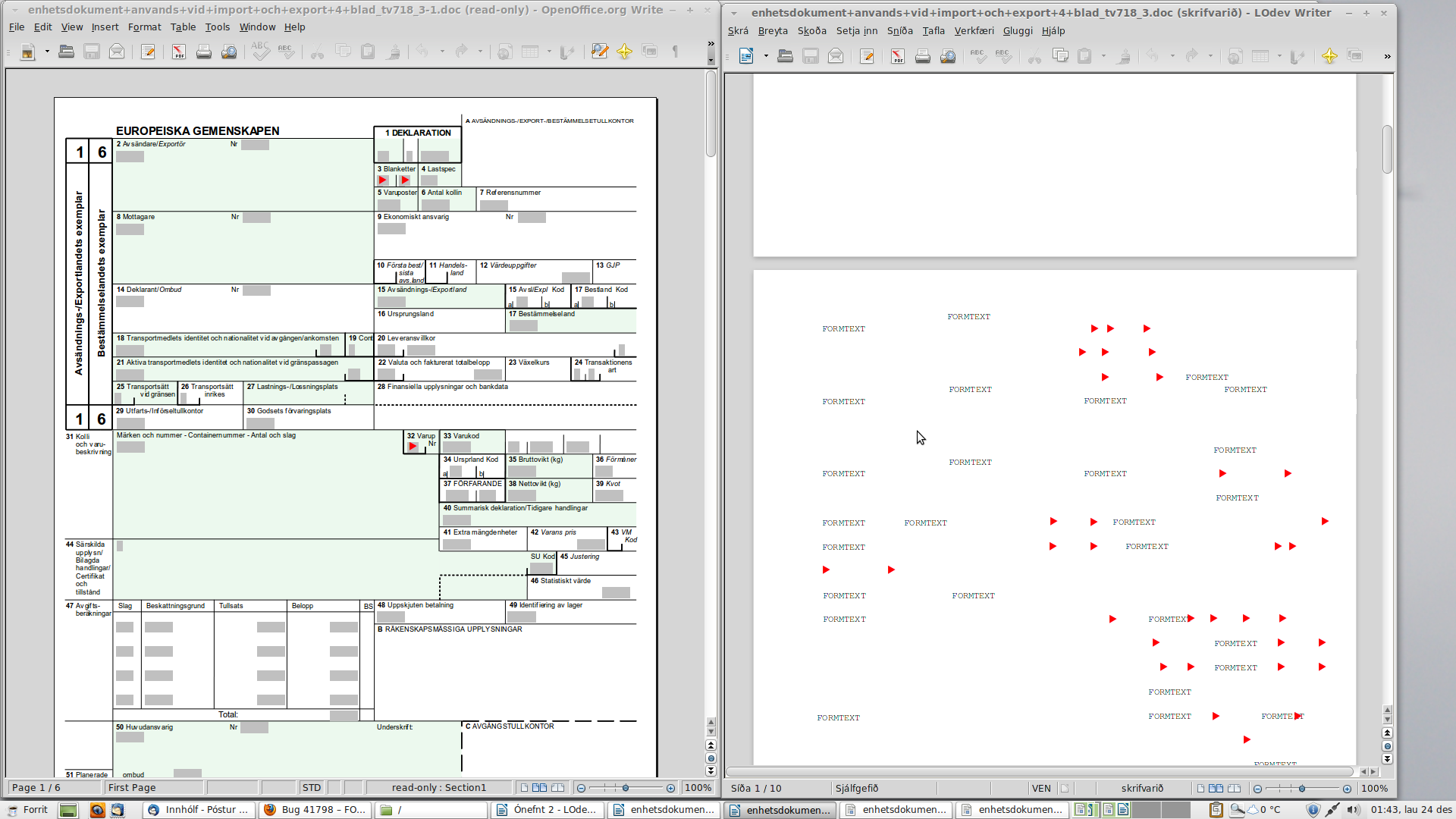 Reproduced with LO 3.4.4 Ubuntu 10.04.3 x86 Linux 2.6.32-35-generic Russian UI [This is an automated message.] This bug was filed before the changes to Bugzilla on 2011-10-16. Thus it started right out as NEW without ever being explicitly confirmed. The bug is changed to state NEEDINFO for this reason. To move this bug from NEEDINFO back to NEW please check if the bug still persists with the 3.5.0 beta1 or beta2 prereleases. Details on how to test the 3.5.0 beta1 can be found at: http://wiki.documentfoundation.org/QA/BugHunting_Session_3.5.0.-1 more detail on this bulk operation: http://nabble.documentfoundation.org/RFC-Operation-Spamzilla-tp3607474p3607474.html Tested the file with LibreOffice 3.5.0 Beta1 (Writer); it's even worse than previous versions - now there's no trace of formatting anymore, just repetitions of FORMTEXT and REF FIELD(number). The document is now spread over 10 pages instead of 6 and is read-only. See the screenshot "enhetsdocument.doc_OO32_LO35B.png" Created attachment 54770 [details]