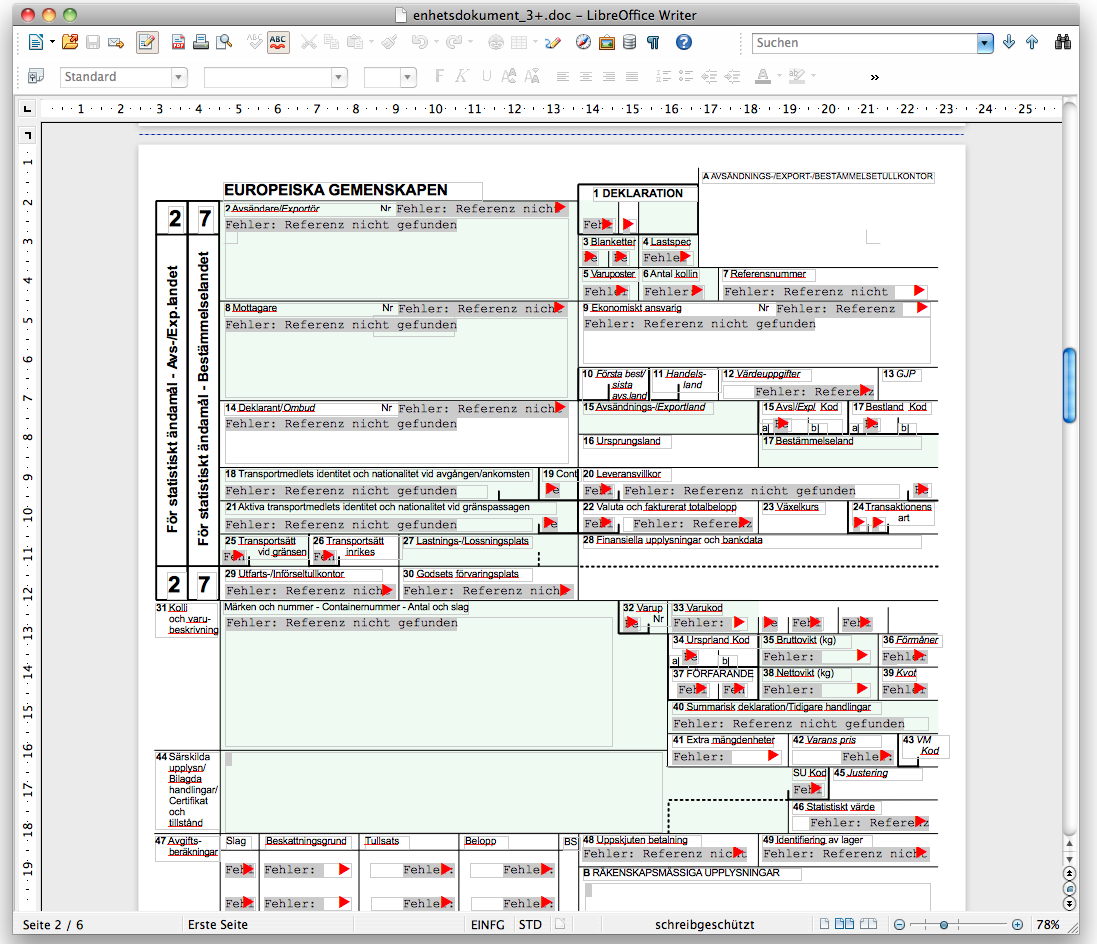 Page 1 looks fine; on page 2, there are many "Fehler: Referenz nicht gefunden" ("Error: reference not found") entries, but the basic page layout seems OK.