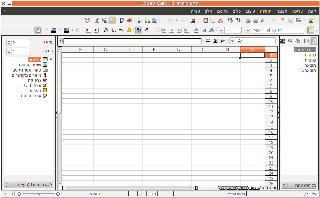 Steps to reproduce: 1. Just start calc normally. No sample document is needed. That's it: you notice the lack of horizontal scroll handle right away. My OS: ubuntu 11.10, using Hebrew UI. Attached is a screenshot showing the lack of horizontal scroll handle. Note that the screenshot cannot show the additional problem: that the arrows are reversed (clicking one of them scrolls the calc document in the opposite direction). If you have more specific questions, ask away and I'll do my best to answer (it is difficult for a user to answer a question like "how to start LibO in a specific locale without installing it"...) Created attachment 55422 [details]