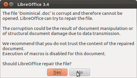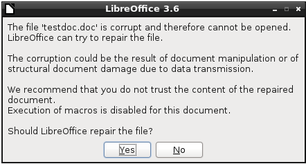Created attachment 57291 [details] Screenshot of the first dialog box. Problem description: I tried opening a corrupt .doc file. Libreoffice tells me "The file '***.doc' is corrupt and therefore cannot be opened. Libreoffice can try to repair the file... Should Libreoffice repair the file?" Then I click no, and I get a dialog box saying "The file could not be repaired and therefore cannot be opened." Then I click ok and it sends me back to the first dialog box. Then I click no, and it keeps going over and over again. Steps to reproduce: 1. ....Try opening corrupt .doc file. 2. ....Click no on the dialog box. 3. ....Click ok on the next dialog box. 4. ....Repeat steps 2-3. Current behavior: The dialog boxes keep popping up over and over again. Expected behavior: It should stop displaying dialog boxes, after I click ok on the second one. Platform (if different from the browser): Ubuntu 11.10 Browser: Mozilla/5.0 (X11; Linux i686) AppleWebKit/535.11 (KHTML, like Gecko) Chrome/17.0.963.46 Safari/535.11