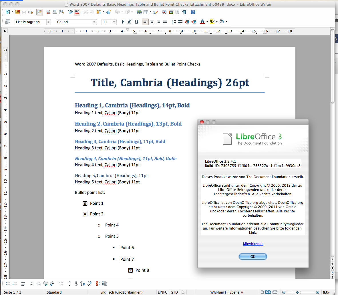 I have downloaded and installed LibreOffice 3.5.4 RC2 (2012-05-24) on Max OSX 10.6 Intel Architecture. The issue with bullet points still exists for both the doc and docx imports of attachment 60428 [details] and attachment 60429 [details]. I will attach screenshots to show. Created attachment 62181 [details]