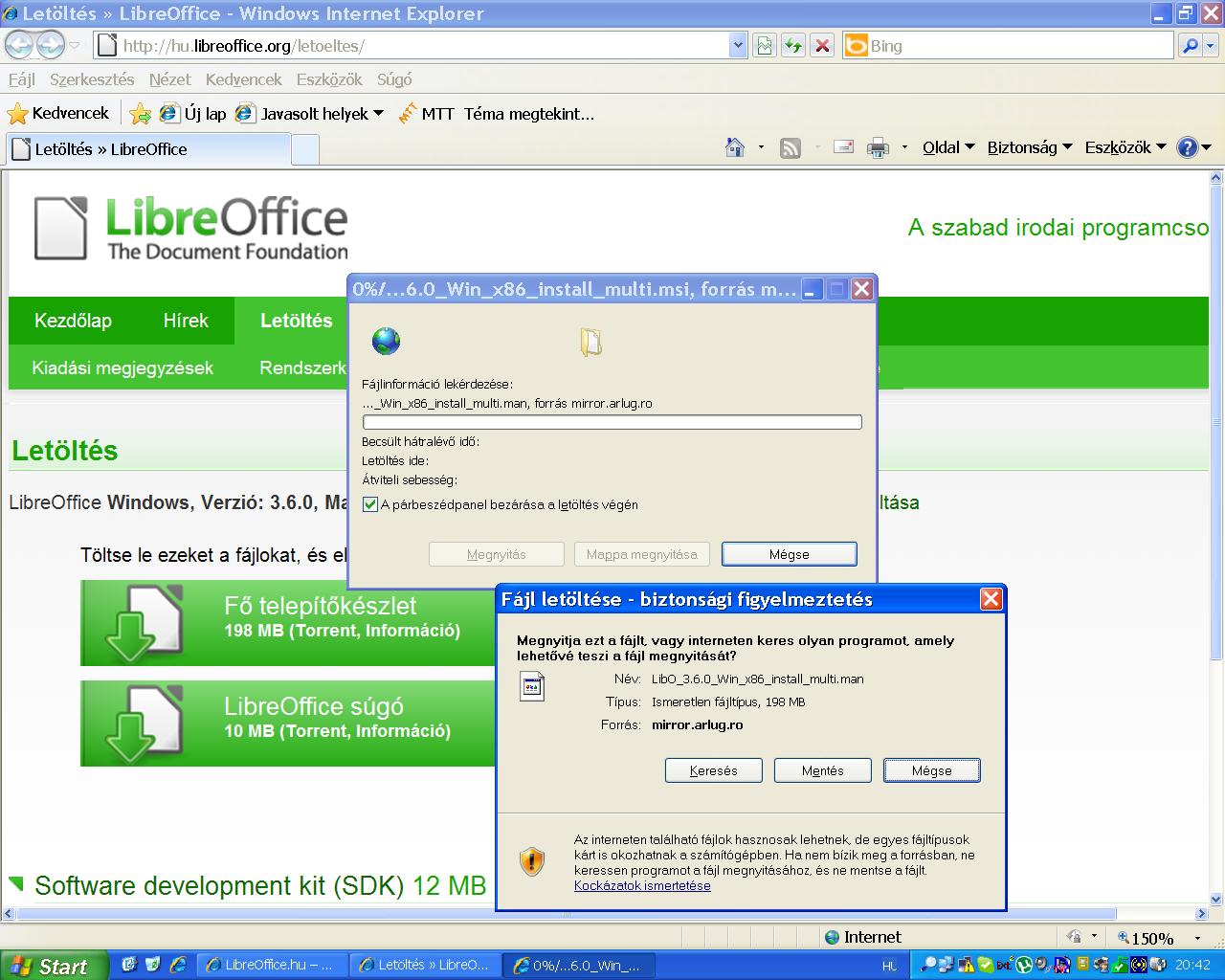 I tried both in libreoffice.hu and libreoffice.org. I examined the Main Installer and the SDK. Maybe the extension is .msi in the web server, but .man at me. By the way, the Hungarian server is very-very slow: 17 KB/s: 3 hour at the Main Installer. You failed to understand what I wrote you on libreoffice.hu. I try to explain once more. When you initiate a download, you are redirected to a mirror. It is neither libreoffice.hu, nor libreoffice.org. Please find out what mirror you use. Browsers usually display this information. E.g. in Firefox you can copy the source link, e.g. http://mirror.lnx.sk/tdf/libreoffice/stable/3.6.0/win/x86/LibO_3.6.0_Win_x86_install_multi.msi (In reply to comment #2) mirror.arlug.ro http://hu.libreoffice.org/letoeltes Click to the text in the green boxes "Fő telepítőkészlet" or "LibreOffice Súgú" or "Software development kit (SDK)". At me, the mirror is always mirror.arlug.ro, and the extension is always .man istead of .msi (at the Windows Installers). I you use other than Windows, in the website http://hu.libreoffice.org/letoeltes first click to the text "Rendszer. verzió vagy nyelv váltása". By the way, in this text, a comma is required instead of a point. Or in the website http://www.libreoffice.org/download/ If you use other than Winodws, click to "Change System, Version or Language" Click to "Main Installer" in a green box. The mirror is mirror.arlug.ro, and the extension is .man. See the attachment. Created attachment 65353 [details]