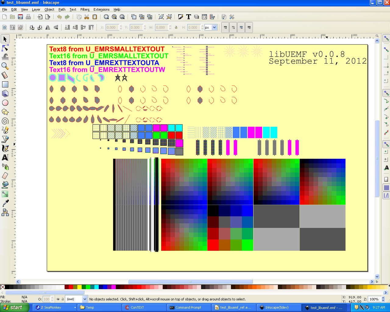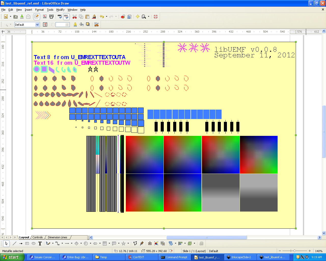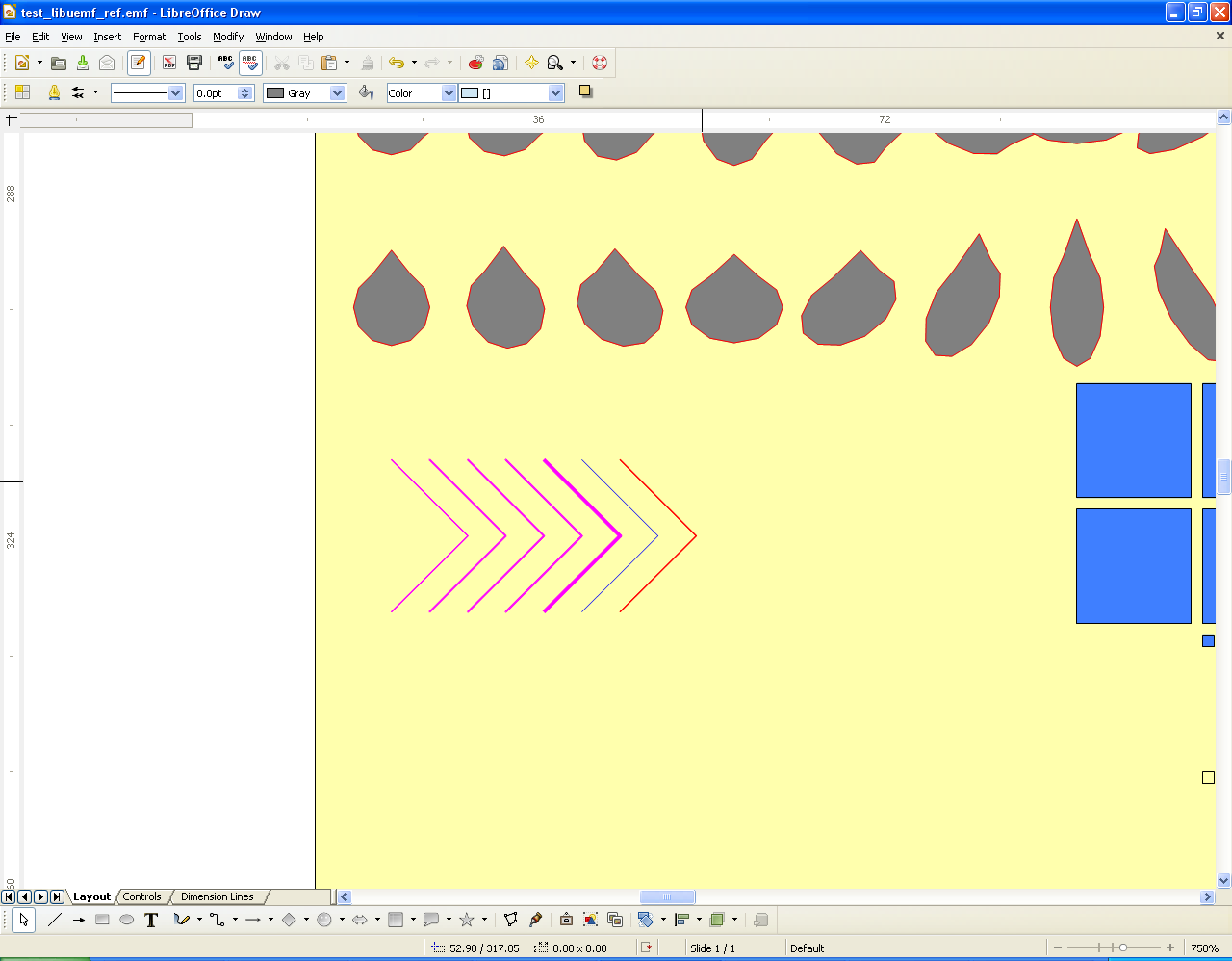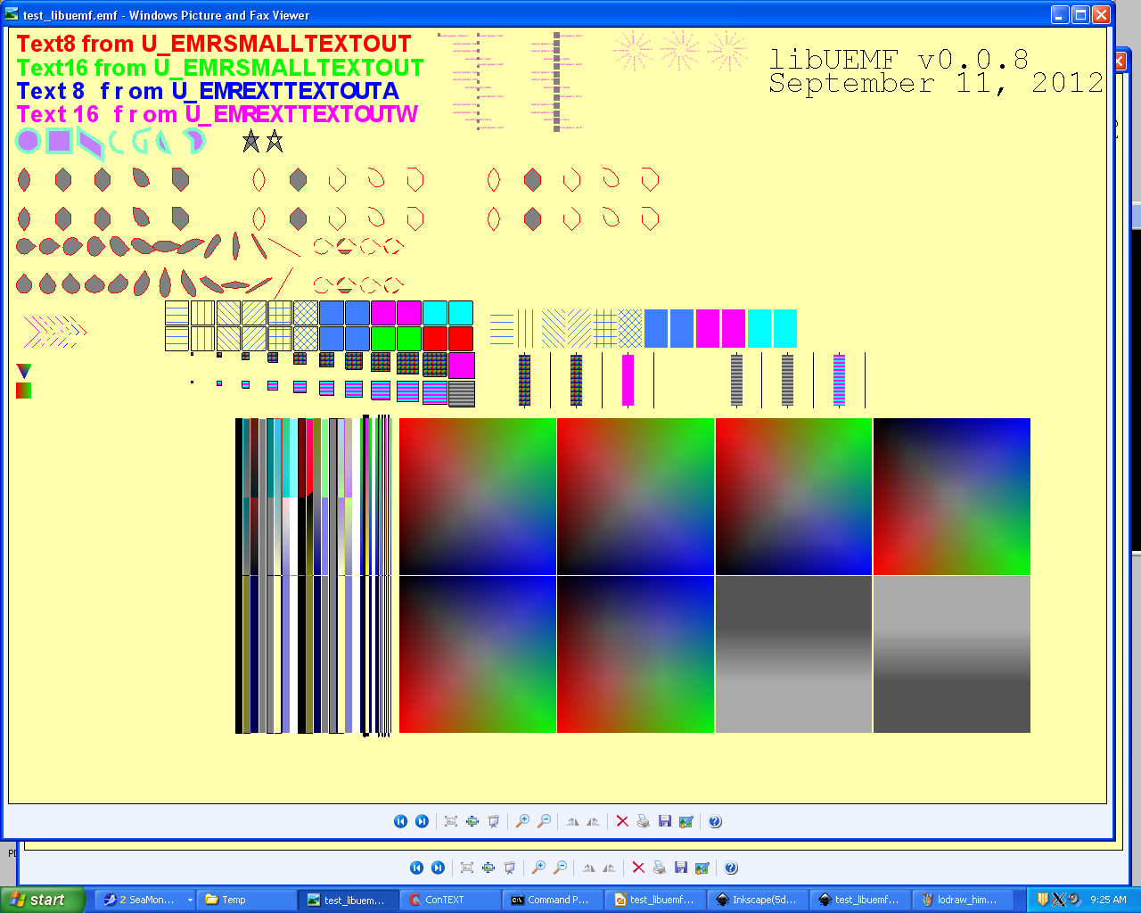 The attachment lodraw_himag3.png was made after "break" - it shows the loss of the dot/dash pattern on the lines. The relevant pieces of code in Inkscape are in the src/extensions/internal directory of that distribution, in the files: emf-inout.cpp emf-inout.h emf-print.cpp emf-print.h uemf.c uemf.h I suspect that items 9 and 10 are due to logic errors in the LODraw equivalent of the code at the top of the main read loop in emf-inout.cpp starting around line 1408. This is the code which determines at what point, during the processing of the EMF file, to stroke/fill each internal object, which turned out to be quite complex. There are also some differences in the handling of EMR_BITBLT between Inkscape and LODraw, but since those operations are very hard to translate to internal objects, I would be hard pressed to say which, if either, is doing it "right". Sorry, forgot the link to libUEMF: http://libuemf.sourceforge.net/ Created attachment 73863 [details]