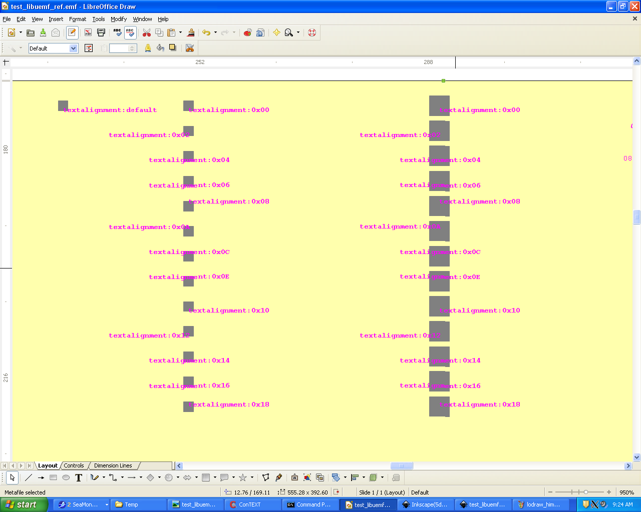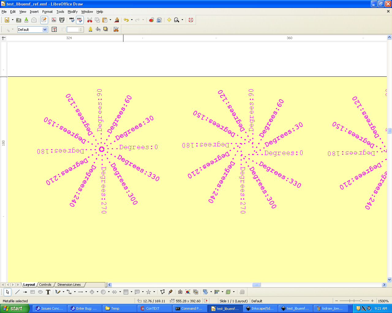 An email exchange with Valek Filippov has turned up an ancient bug in the EMF input implementation in inkscape - EMF WORLDTRANSFORM records with nonidentity rotation matrices result in a mangled drawing. Unfortunately LibreOffice 3.6 (on Windows XP, 32 bit) has much the same issue. The attached file is thoroughly mangled when imported into LODraw.