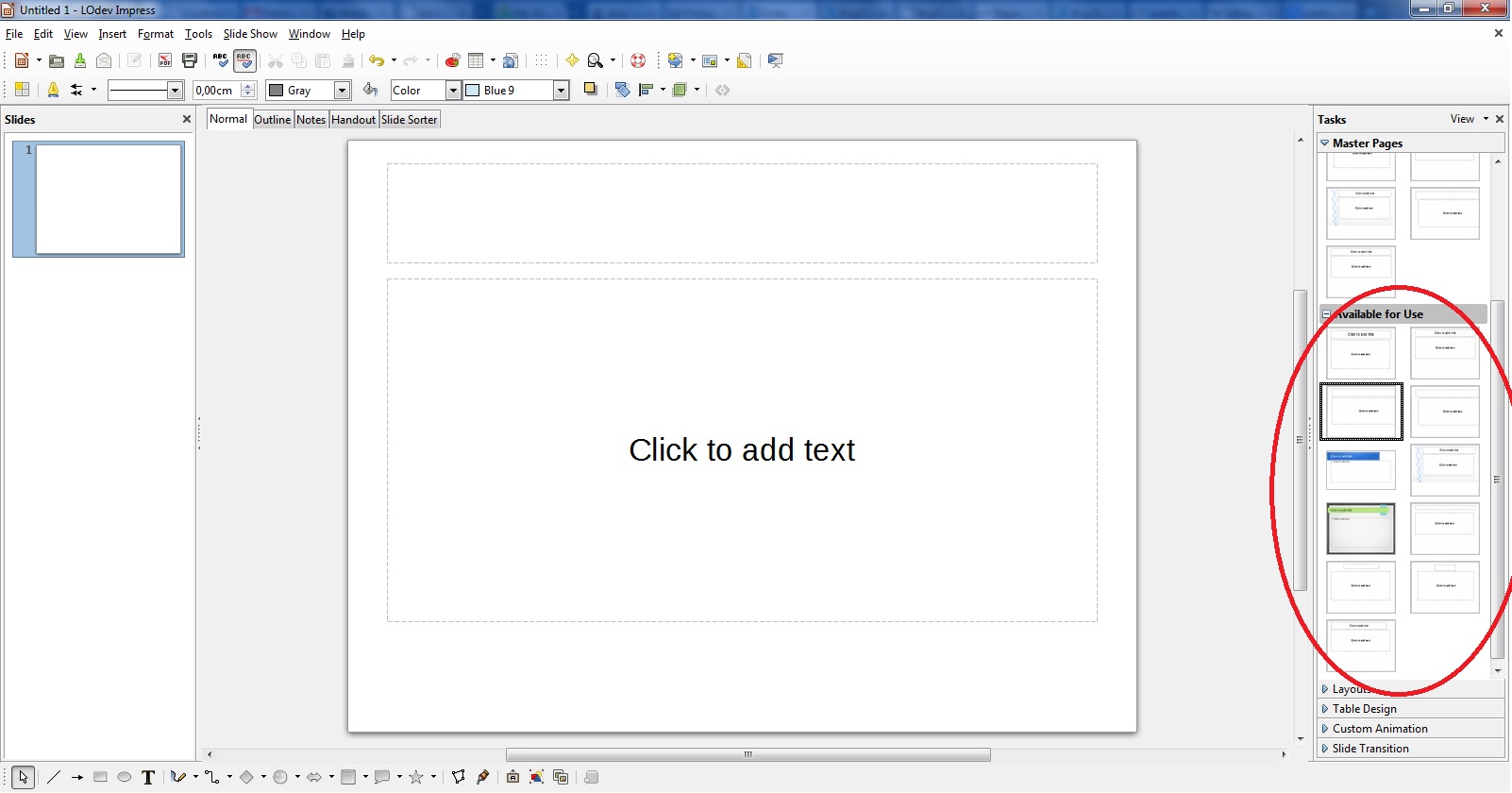 [Reproducible] with parallel installation of Master "LOdev 4.0.0.0.alpha0+ - ENGLISH UI / German Locale [Build ID: a2b3ee)]" {tinderbox: @6, pull time 2012-11-13 06:07:28} on German WIN7 Home Premium (64bit) with separate /4 User Profile for Master Branch: All Styles clicked in 'Tasks-Pane -> Available for use' change view in Tasks pane to "Default", but will not be applied for current slide.