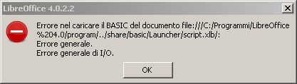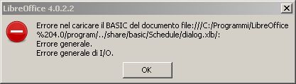 Created attachment 78077 [details] Screenshot of the error. After a fresh installation I receive four error boxes at each component startup except Base: 1. Errore nel caricare il BASIC del documento file:///C:/Programmi/LibreOffice%204.0/program/../share/basic/Launcher/script.xlb/: Errore generale. Errore generale di I/O. 2. Errore nel caricare il BASIC del documento file:///C:/Programmi/LibreOffice%204.0/program/../share/basic/Schedule/script.xlb/: Errore generale. Errore generale di I/O. 3. Errore nel caricare il BASIC del documento file:///C:/Programmi/LibreOffice%204.0/program/../share/basic/Launcher/dialog.xlb/: Errore generale. Errore generale di I/O. 4. Errore nel caricare il BASIC del documento file:///C:/Programmi/LibreOffice%204.0/program/../share/basic/Schedule/dialog.xlb/: Errore generale. Errore generale di I/O. then it starts. The files reported in above messages doesn't exists in the specified path. I'm running on WindowsXP Pro SP3. regards, Fabrizio