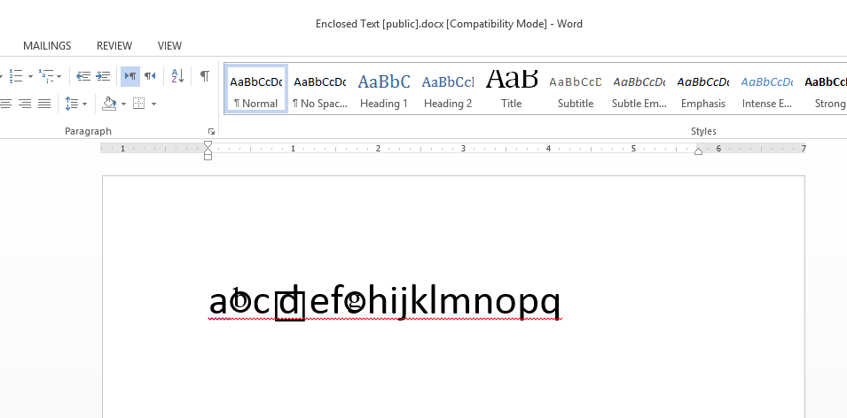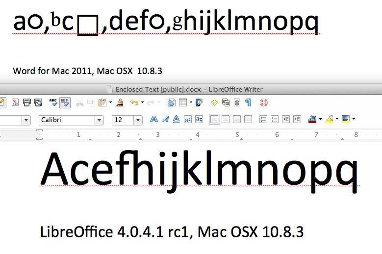 (In reply to comment #3) > Created attachment 80168 [details] > Screenshot with good and bad behavior Hi @Jerome, Very strange you got what you got on Word for Mac. The actual way it *should* look is the square \ circle should be on top of the letters, like the screenshot I provided from Word 2013 on Windows 8. That's what the documentation says, anyway... Comment on attachment 80168 [details]