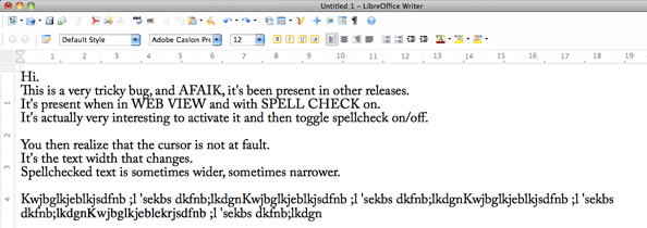 Just added attachement 89961 Shows the same bug in CALC AFAIK, the bug is not present in IMPRESS and DRAW I recognize this bug specially in IMPRESS. Regards Marcus (In reply to comment #30) > I recognize this bug specially in IMPRESS. > Regards > Marcus Marcus, I did my best to replicate in IMPRESS and could not. Can you post your procedure and/or a sample file. I am using Version: 4.1.3.2 Build ID: 70feb7d99726f064edab4605a8ab840c50ec57a On OsX 10.6.8 MacBookAir3,1 *** Bug 72860 has been marked as a duplicate of this bug. *** Bug name just been changed from: VIEWING: Cursor displaced in Web Layout when misspelled text is highlighted to: Cursor is sometimes misplaced when editing text on Mac OS X and that's not the accurate description. Sugegsted FULL DESCRIPTION: The default is activated by enabling spellcheck in some viewing modes including WRITER Web View and CALC. It changes the displayed text length upon various unindentified parameters including text content and displayed font. Suggested COMMENT: The cursor stays at the same place as it would be with spellchech dis-activated, and is therefore not alligned with displayed text insert point when the bug is active. For this reason the bug is sometimes refered as "faulty cursor". Truth is, it is a text display bug. Enabling spellcheck should NOT change text layout. We suspect a letter spacing rounding error. Suggested TITLE: "Activating spellcheck changes the letter-spacing on Mac OS" ref: http://en.wikipedia.org/wiki/Letter-spacing "mal nommer les choses, c'est ajouter au malheur du monde" Albert Camus Created attachment 91221 [details]