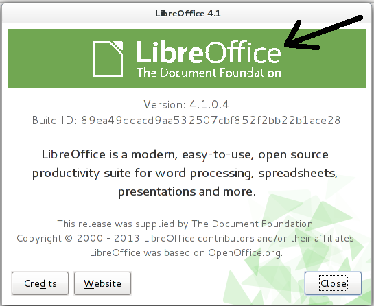 (In reply to comment #13) > I know that you should not judge a book by it's cover, but I think action > must be taken before someone uses this to accuse LibO of being a buggy > software... > > I mean, somebody could argue that "LibO comes out with a scrambled about > box, would you dare compose your documents with such a software?" That's what I think too! 486x80 -> original /opt/libreoffice4.1/program/flat_logo.svg 665x109 -> cut out on a screenshot, looks as if it has been enlarged, maybe thats the problem? Created attachment 88560 [details]