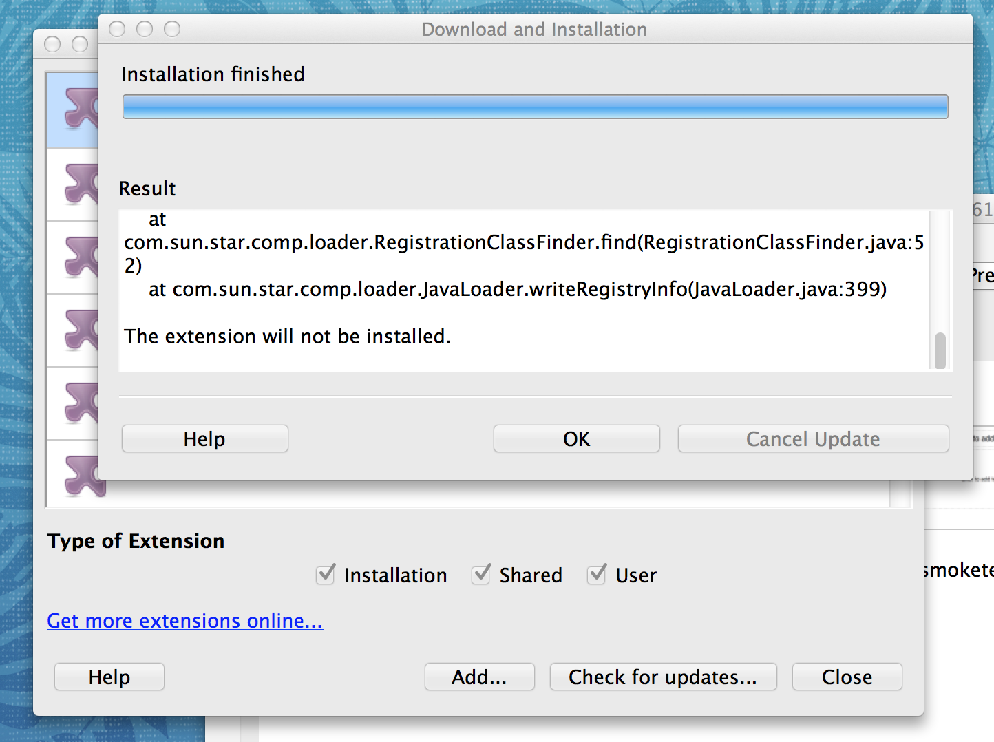 Stephan does this persist with the latest nightly? http://dev-builds.libreoffice.org/daily/master/MacOSX-x86@49-TDF/current/ Also can you provide any steps to reproduce this issue? Dear Bug Submitter, This bug has been in NEEDINFO status with no change for at least 6 months. Please provide the requested information as soon as possible and mark the bug as UNCONFIRMED. Due to regular bug tracker maintenance, if the bug is still in NEEDINFO status with no change in 30 days the QA team will close the bug as INVALID due to lack of needed information. For more information about our NEEDINFO policy please read the wiki located here: https://wiki.documentfoundation.org/QA/FDO/NEEDINFO If you have already provided the requested information, please mark the bug as UNCONFIRMED so that the QA team knows that the bug is ready to be confirmed. Thank you for helping us make LibreOffice even better for everyone! Warm Regards, QA Team Dear Bug Submitter, Please read this message in its entirety before proceeding. Your bug report is being closed as INVALID due to inactivity and a lack of information which is needed in order to accurately reproduce and confirm the problem. We encourage you to retest your bug against the latest release. If the issue is still present in the latest stable release, we need the following information (please ignore any that you've already provided): a) Provide details of your system including your operating system and the latest version of LibreOffice that you have confirmed the bug to be present b) Provide easy to reproduce steps – the simpler the better c) Provide any test case(s) which will help us confirm the problem d) Provide screenshots of the problem if you think it might help e) Read all comments and provide any requested information Once all of this is done, please set the bug back to UNCONFIRMED and we will attempt to reproduce the issue. Please do not: a) respond via email b) update the version field in the bug or any of the other details on the top section of FDO |