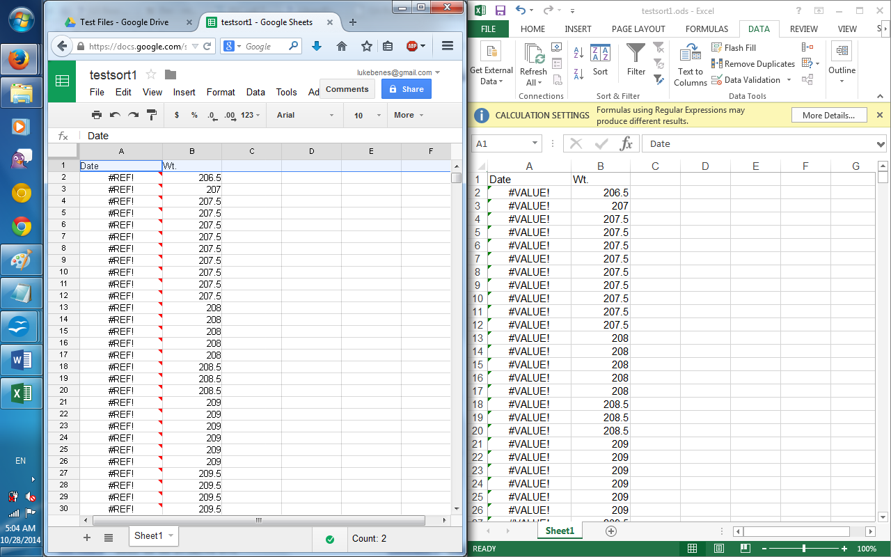 Hi Joe, thanks for reporting. I can't reproduce you issue with your file, sort fine for me. Win7x64 Version 4.0.6.2 (Build ID: 2e2573268451a50806fcd60ae2d9fe01dd0ce24) If you are sure both columns are selected, please try resetting the user profile, sometimes solves strange issues: https://wiki.documentfoundation.org/UserProfile How can you cancel a bug report so fast? You didn't ask for another file. The problem occurs on the file called Water Diary which I didn't send you. It is 1600 rows long. If you tried that fucking file you would see my point, you dummy. On 08/12/2013 6:17 PM, bugzilla-daemon@freedesktop.org wrote: > mariosv <mailto:mariosv@miguelangel.mobi> changed bug 72487 > <https://bugs.freedesktop.org/show_bug.cgi?id=72487> > What Removed Added > CC mariosv@miguelangel.mobi > > *Comment # 1 <https://bugs.freedesktop.org/show_bug.cgi?id=72487#c1> > on bug 72487 <https://bugs.freedesktop.org/show_bug.cgi?id=72487> from > mariosv <mailto:mariosv@miguelangel.mobi> * > Hi Joe, thanks for reporting. > > I can't reproduce you issue with your file, sort fine for me. > Win7x64 > Version 4.0.6.2 (Build ID: 2e2573268451a50806fcd60ae2d9fe01dd0ce24) > > If you are sure both columns are selected, please try resetting the user > profile, sometimes solves strange issues: > https://wiki.documentfoundation.org/UserProfile > ------------------------------------------------------------------------ > You are receiving this mail because: > > * You reported the bug. > (In reply to comment #2) > How can you cancel a bug report so fast? You didn't ask for another > file. The problem occurs on the file called Water Diary which I didn't > send you. It is 1600 rows long. > If you tried that fucking file you would see my point, you dummy. We cannot try with a non-existing file... Provide a file with the bug and/or give more information about this file and the way you sort. Hi Joe, I don't remember have cancelled the bug, why do you think so?, you can see the history modifications on the link top left. comment#1, your sample file works fine for me. Have you tried resetting user profile, as suggested? Okay, I re-read your first reply, and I made a mistake thinking it was Removed, because I saw the word "Removed" in the top line. So, I apologize for my behavior, I'm the dummy. Joe On 09/12/2013 4:17 AM, bugzilla-daemon@freedesktop.org wrote: > > *Comment # 4 <https://bugs.freedesktop.org/show_bug.cgi?id=72487#c4> > on bug 72487 <https://bugs.freedesktop.org/show_bug.cgi?id=72487> from > mariosv <mailto:mariosv@miguelangel.mobi> * > Hi Joe, I don't remember have cancelled the bug, why do you think so?, you can > see the history modifications on the link top left. > > comment#1 <show_bug.cgi?id=72487#c1>, your sample file works fine for me. > Have you tried resetting user profile, as suggested? > ------------------------------------------------------------------------ > You are receiving this mail because: > > * You reported the bug. > Created attachment 90523 [details] attachment-31361-0.html I renamed the User folder to User-old. After restarting Libre Office Calc, the same problem exists. I am attaching 2 files; testsort1 and testsort2. Testsort1 shows 2 columns 1600 rows with dates and numbers. I sorted that in descending mode using the Wt. column, and the resulting mess is viewable in testsort2. The dates don't match the weights, and some more recent dates are missing and replaced by ###VALUE. IE, the dates should NOT be all in order from past to more recent. They should be all mixed up. :-( Joe On 09/12/2013 3:16 AM, bugzilla-daemon@freedesktop.org wrote: > GerardF <mailto:gerard.fargeot@orange.fr> changed bug 72487 > <https://bugs.freedesktop.org/show_bug.cgi?id=72487> > What Removed Added > Status UNCONFIRMED NEEDINFO > CC gerard.fargeot@orange.fr > Ever confirmed 1 > > *Comment # 3 <https://bugs.freedesktop.org/show_bug.cgi?id=72487#c3> > on bug 72487 <https://bugs.freedesktop.org/show_bug.cgi?id=72487> from > GerardF <mailto:gerard.fargeot@orange.fr> * > (In reply tocomment #2 <show_bug.cgi?id=72487#c2>) > > How can you cancel a bug report so fast? You didn't ask for another > > file. The problem occurs on the file called Water Diary which I didn't > > send you. It is 1600 rows long. > > If you tried that fucking file you would see my point, you dummy. > > We cannot try with a non-existing file... > Provide a file with the bug and/or give more information about this file and > the way you sort. > ------------------------------------------------------------------------ > You are receiving this mail because: > > * You reported the bug. > Created attachment 90524 [details]