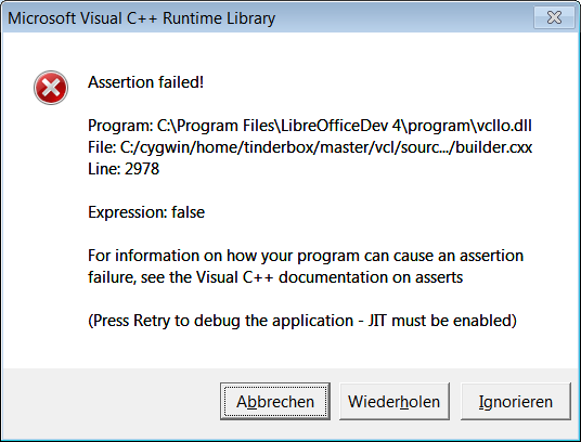 Reproducible: Win7x64 Version: 4.4.0.0.alpha0+ Build ID: dc91ebed1a3b0ef900b1bb5cf203c6a9aeb83016 TinderBox: Win-x86@39, Branch:master, Time: 2014-05-26_01:36:09 Selecting twice "Ignore" Libreoffice continues running. Windbg " Assertion failed! Program: ...XXXX\Downloads\LibreOfficeMaster\program\vcllo.dll File: C:/cygwin/home/tinderbox/master/vcl/sourc.../builder.cxx Line: 2978 Expression: false For information on how your program can cause an assertion failure, see the Visual C++ documentation on asserts (Press Retry to debug the application - JIT must be enabled)Assertion failed! Program: ...XXXX\Downloads\LibreOfficeMaster\program\vcllo.dll File: C:/cygwin/home/tinderbox/master/vcl/sourc.../builder.cxx Line: 2978 Expression: false For information on how your program can cause an assertion failure, see the Visual C++ documentation on asserts (Press Retry to debug the application - JIT must be enabled) " On pc Debian x86-64 with master sources updated today, I could reproduce this. It seems that every entry of stats (at least first four) make LO crash. I could reproduce the crash with 4.3 sources updated 1 week ago but not with 4.2 sources updated some days ago. Created attachment 103552 [details]