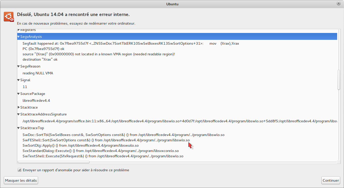 screenshot of the report from Ubuntu with segfault and stacktrace.
