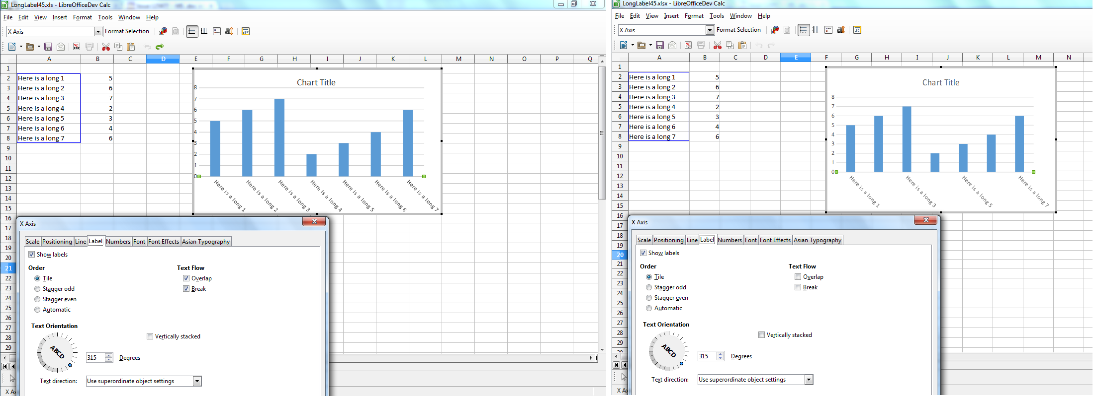 confirmed under Win7x64 using 4.3.2.2 and 4.4.0.0.alpha0+ Build ID: 268b9c10c9ff27c74678ace99762f28d58d33012 TinderBox: Win-x86@42, Branch:master, Time: 2014-10-02_23:35:24 it seems that 50% of the labels in the x axis are not shown same issue even with older LibO release (tried with 3.4.3) and in AOO 4.1.0 as well so the bug is likely to be inherited from OOo Sushil Shinde committed a patch related to this issue. It has been pushed to "master": http://cgit.freedesktop.org/libreoffice/core/commit/?id=4027bc476a1df9df1924447795ddc2d8b7744e20 fdo#84647 : Fixed default value for TickLableSkip value. The patch should be included in the daily builds available at http://dev-builds.libreoffice.org/daily/ in the next 24-48 hours. More information about daily builds can be found at: http://wiki.documentfoundation.org/Testing_Daily_Builds Affected users are encouraged to test the fix and report feedback. Steps to reproduce: 1. Create a chart in Excel with long label names (2 or more lines) 2. Save as .XLS and .XLSX 3. Open in Calc When Calc imports Excel XLS charts, it correctly sets: Text FLow:Break-enabled But for XLSX charts it sets Text FLow:Break-DISABLED This causes as the labels in XLSX to overlap and makes them unreadable. @Joey Reid have you tested that with recent 4.0.x daily builds? those are the only LibO versions featuring that bugfix Tommy, Yes, Sushil fixed the Text Flow:Overlap default. I verified that's it's working now with the latest 4.4 builds. Instead of messing up this report, I just now created Bug 85491 for the Text FLow:Break default. Sushil, Should this bug report be reopened? In recent builds Text Flow:Overlap is not being set any more. Hi Luke, This issue was fixed in two parts, 1. https://gerrit.libreoffice.org/#/c/11901/ 2. https://gerrit.libreoffice.org/#/c/12213/ Second patch is not yet merged to master. If possible, Please apply these patches and verify. If this issue still reproducible then reopen it. I will look into it. Thanks. |
