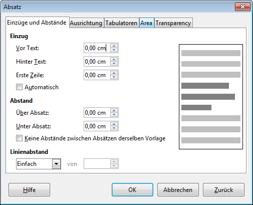Created attachment 109905 [details] screenshot with paragraph formating dialog Reproduction: 1) Open the atached odt 2) double click in the text of the Textshape 3) click at the paragraph format icon in the menu bar 4) see the dialog window with tabs for changing format of the paragraph formats 5) you see tabs for "Einzug..", "Ausrichtung", "Tabulator", "Area", "Transparency" (see the attached screenshot) 6) click on Area and Transparency aren't working Expexted behavior: By click on Area and Transparency the same issues as in a text paragraph in a normal text OR no Tab fpr Area and Transparency ;-)