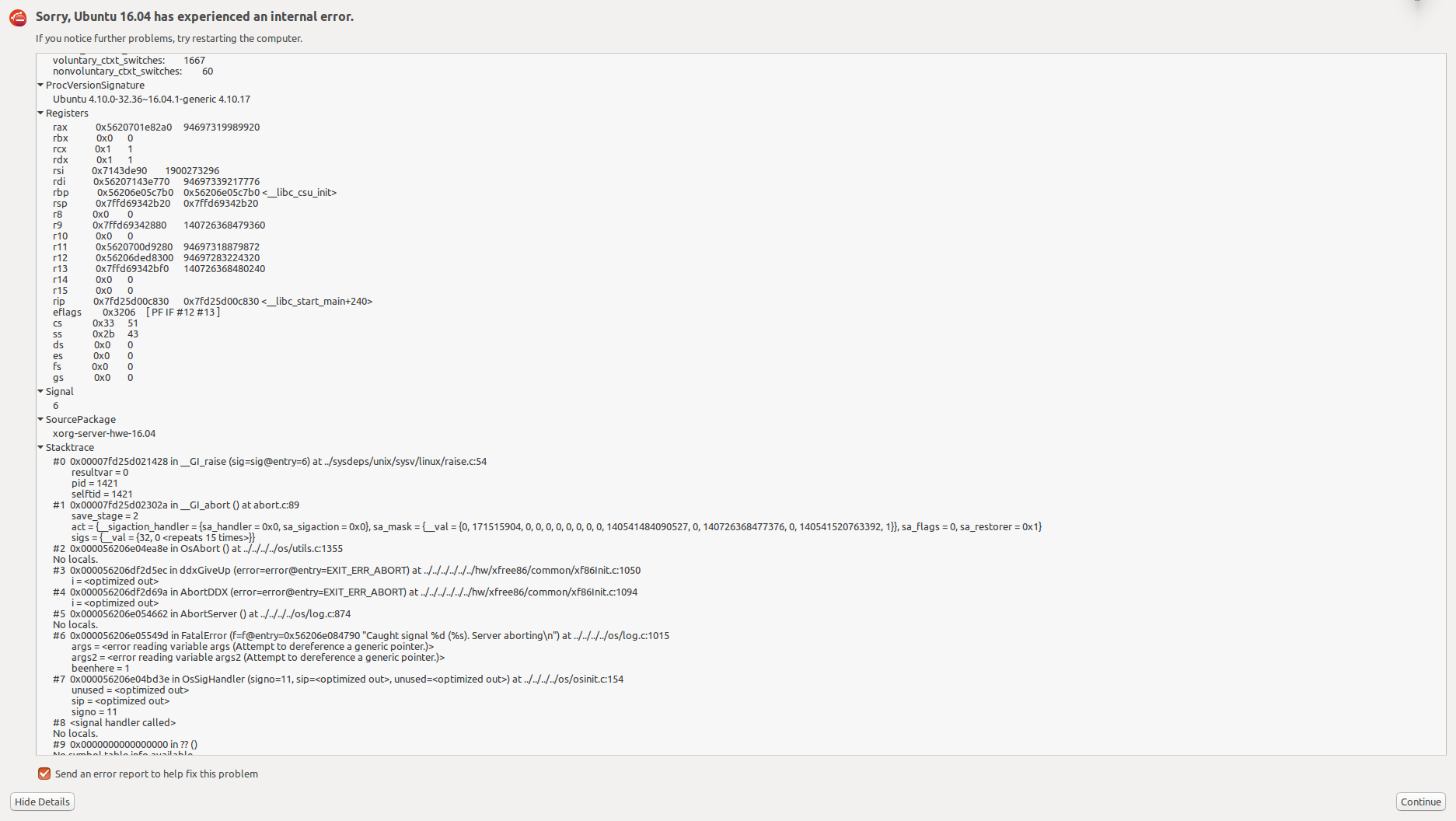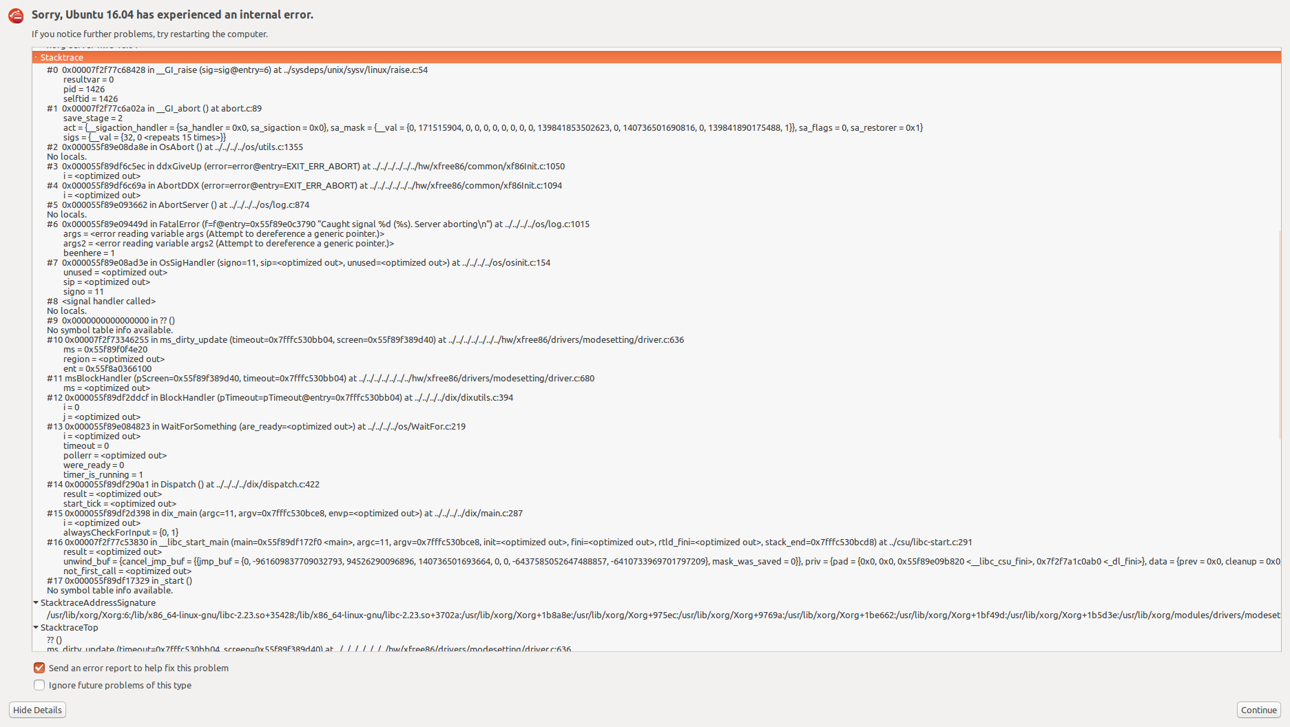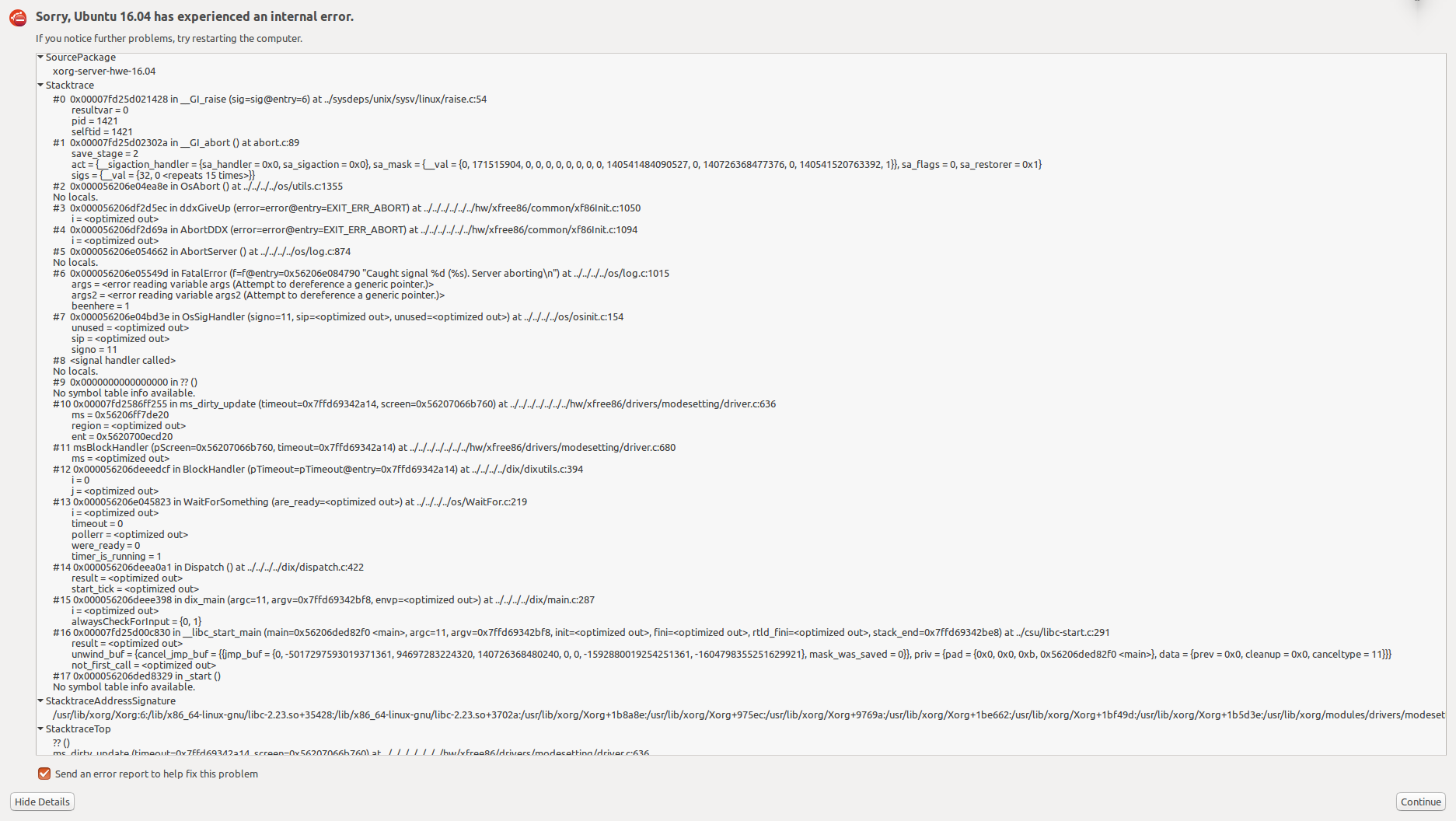 The Ubuntu HWE16.04 package xserver-xorg-core-hwe-16.04-dbg exists but does not seem to contain any debugging symbols. Installed files: /. /usr /usr/share /usr/share/doc /usr/share/doc/xserver-xorg-core-hwe-16.04-dbg /usr/share/doc/xserver-xorg-core-hwe-16.04-dbg/changelog.Debian.gz /usr/share/doc/xserver-xorg-core-hwe-16.04-dbg/copyright Hence gdb will not debug this. Also: What is the recommended way to safely bring down the existing xserver? I tried 'service lightdm stop' from vt1, but this leaves Xorg and several other X-related processes (xinit, xfailsave) hanging around. Nevertheless, I will attach a dmesg output with the corresponding Xorg.0.log.