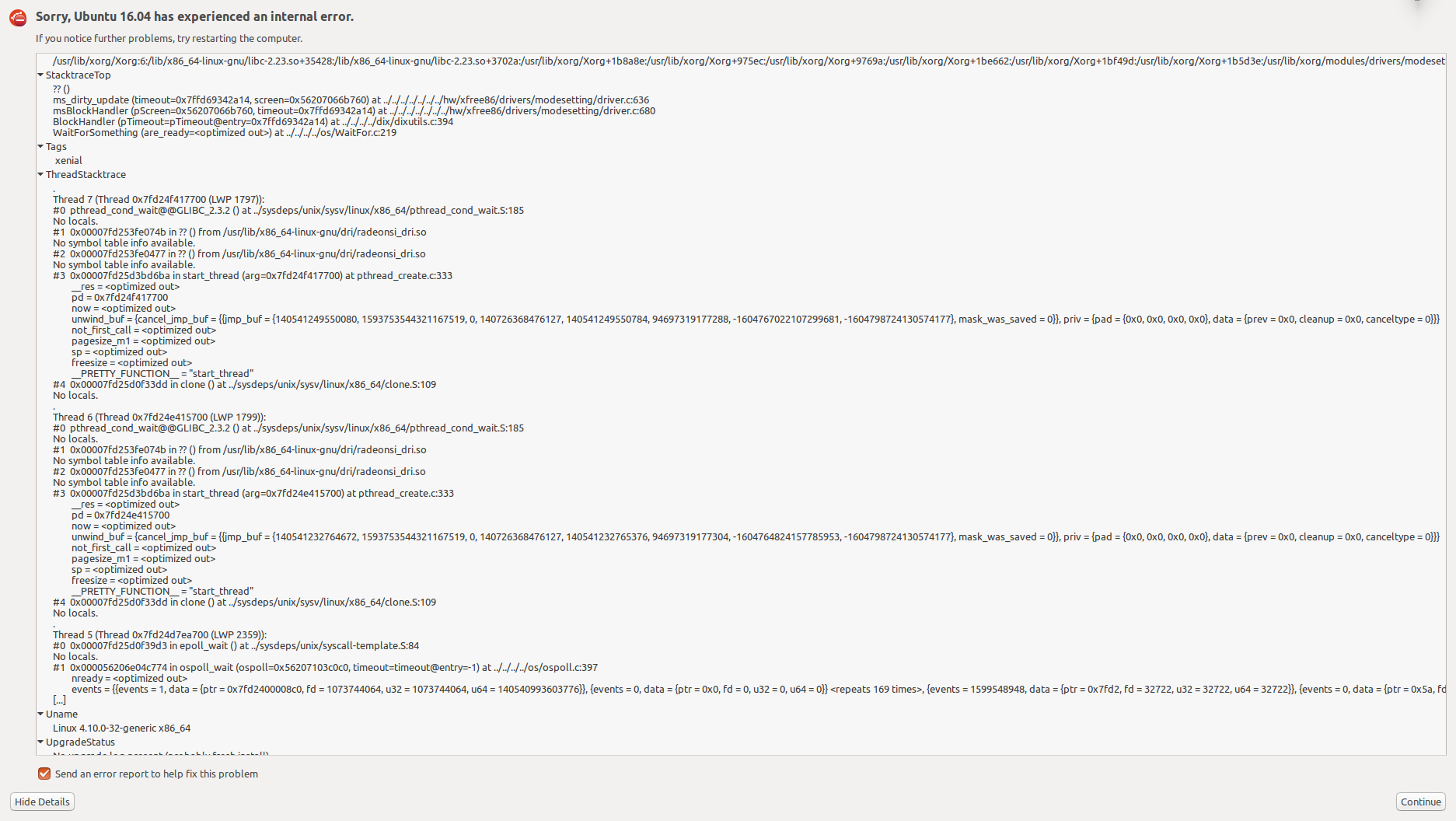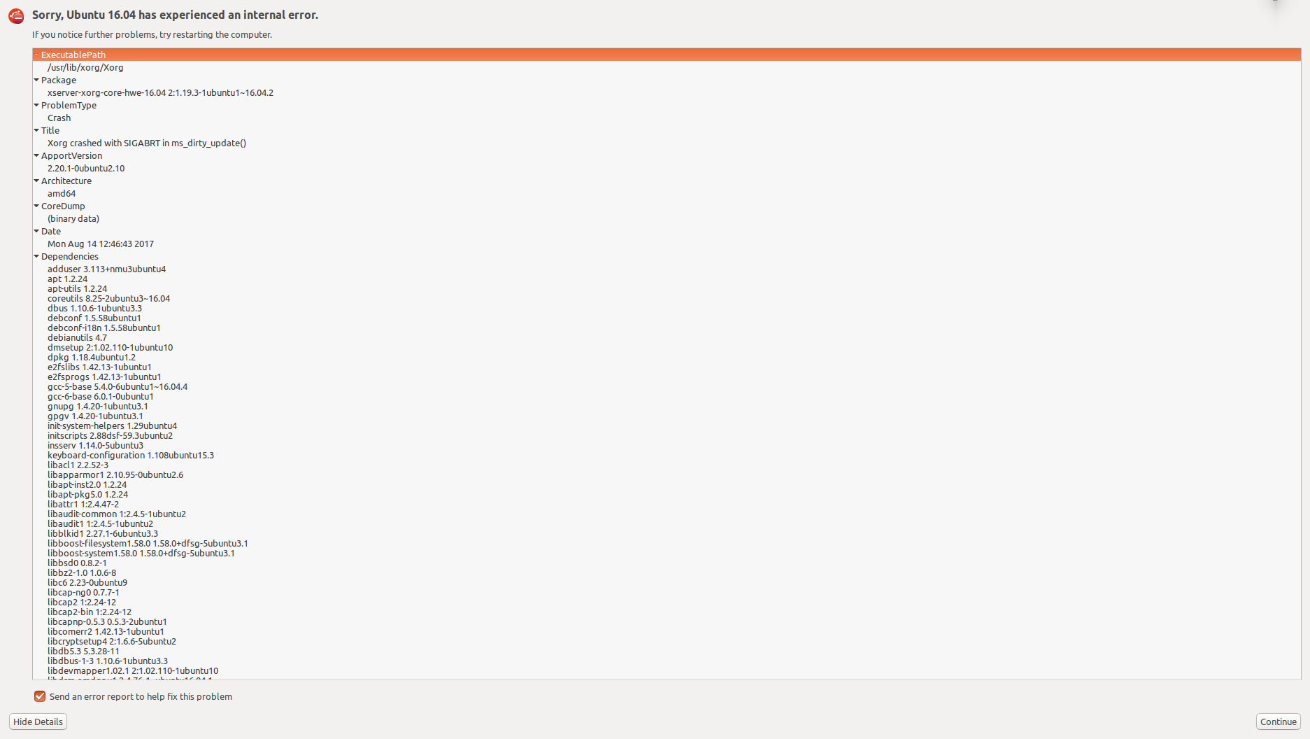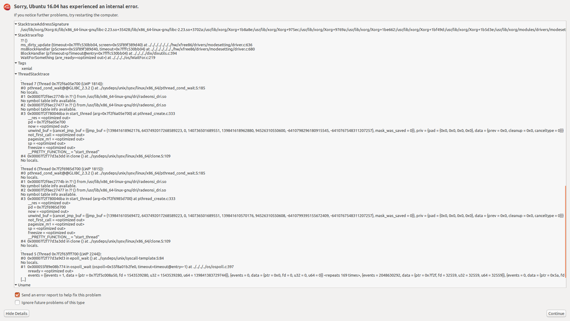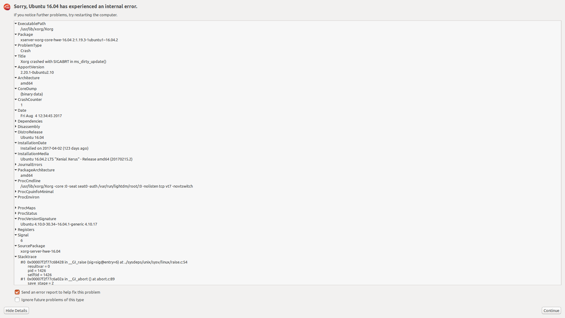 The Ubuntu HWE16.04 package xserver-xorg-core-hwe-16.04-dbg exists but does not seem to contain any debugging symbols. Installed files: /. /usr /usr/share /usr/share/doc /usr/share/doc/xserver-xorg-core-hwe-16.04-dbg /usr/share/doc/xserver-xorg-core-hwe-16.04-dbg/changelog.Debian.gz /usr/share/doc/xserver-xorg-core-hwe-16.04-dbg/copyright Hence gdb will not debug this. Also: What is the recommended way to safely bring down the existing xserver? I tried 'service lightdm stop' from vt1, but this leaves Xorg and several other X-related processes (xinit, xfailsave) hanging around. Nevertheless, I will attach a dmesg output with the corresponding Xorg.0.log.