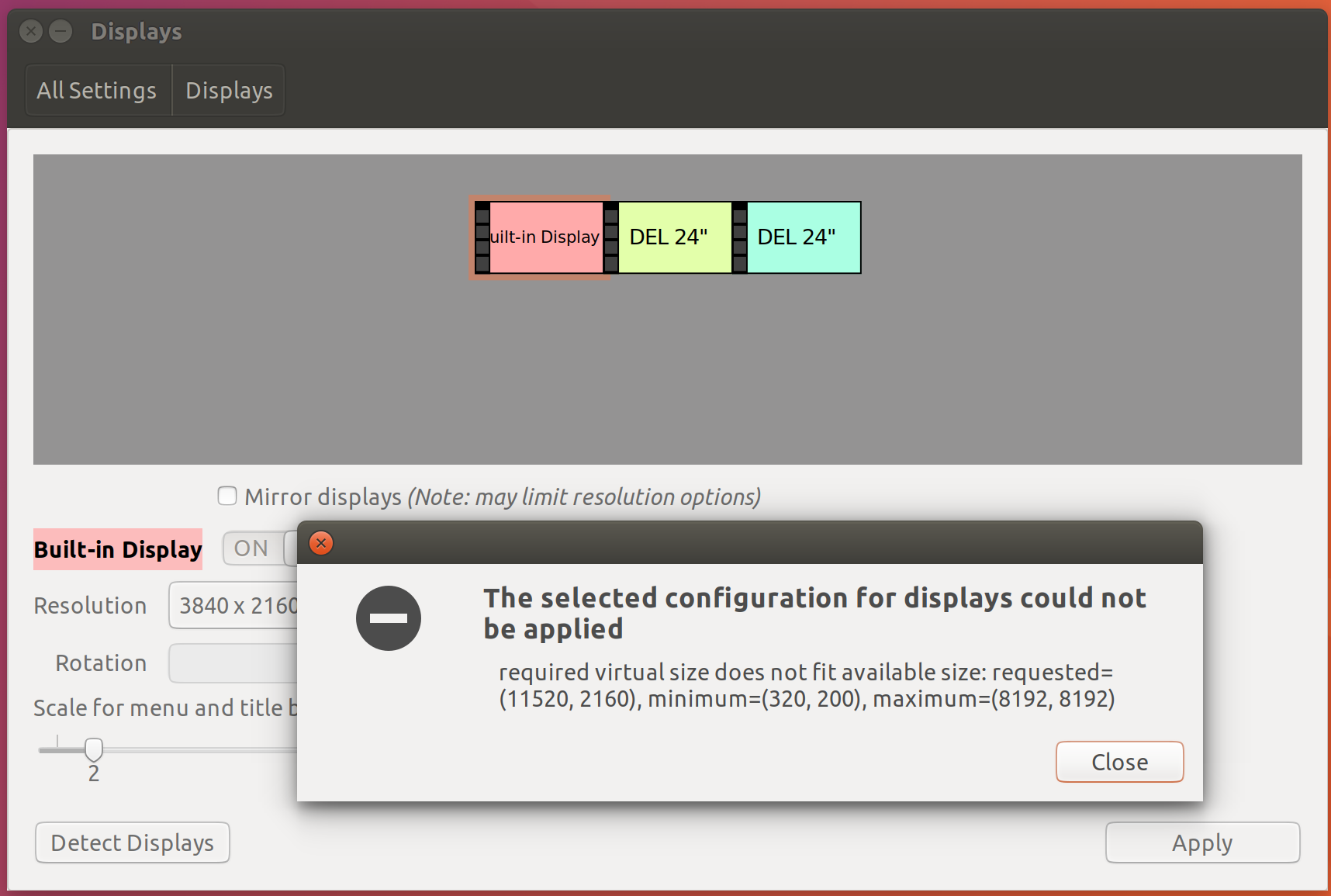 Created attachment 133922 [details] Xorg.0.log After applying the following patch, all three screens turn into black screens after I change the display mode from mirror mode to extended mode. (Log: attached Xorg.0.log and kernel log (attachment 133921 [details])) ubuntu-zesty/drivers/gpu/drm/i915/intel_display.c @@ -16458,9 +16458,12 @@ int intel_modeset_init(struct drm_device *dev) dev->mode_config.max_width = 4096; dev->mode_config.max_height = 4096; } else { - dev->mode_config.max_width = 8192; - dev->mode_config.max_height = 8192; + dev->mode_config.max_width = 16384; + dev->mode_config.max_height = 16384; }