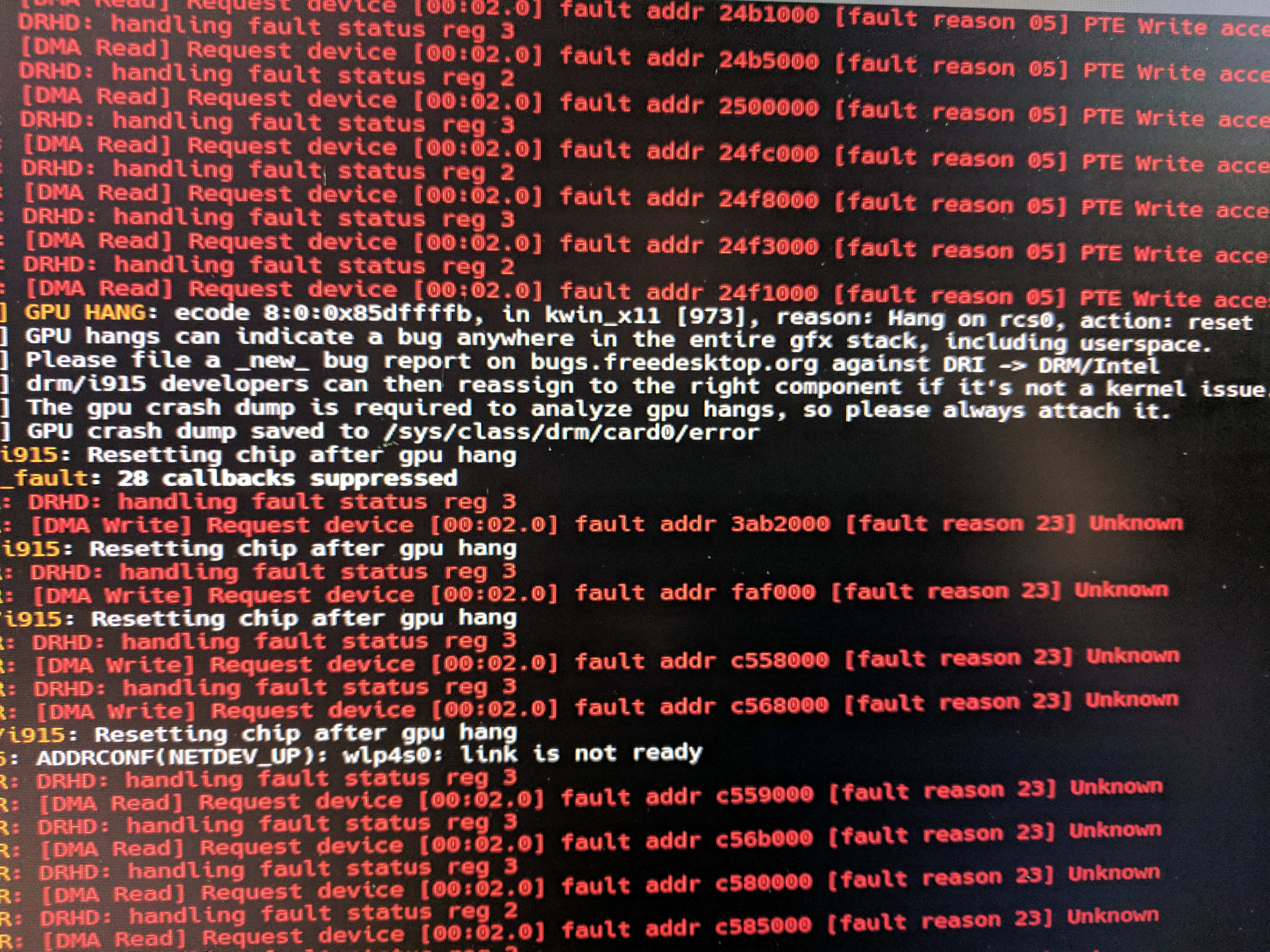 Created attachment 134784 [details] error output sometimes takes 12 hours sometimes every 2m... all depends on the GPU/DRI etc.. I have a jpg of the actually dmesg output but wont let me attach more than one file.. I will in the comment if I can.. but error goes along the lines: GPU HANG: ecode XXXXXXX in Kwin_x11, reason Hang on rcs0, action reset then it tells me to fine a report with the file attached before and after this msg I get TONS OF: [DMA READ] Request device [00:02.0] fault addr 24f1000 [fault reason 05] PTE Write access.... DRHD: handling fault status reg 2 and similar as above with [fault reason 23] Unknown and DRHD status reg 3 This started like 1 week a go not sure if is my hardware that is faulty (is been working fine for 1 year) or and Xorg update...