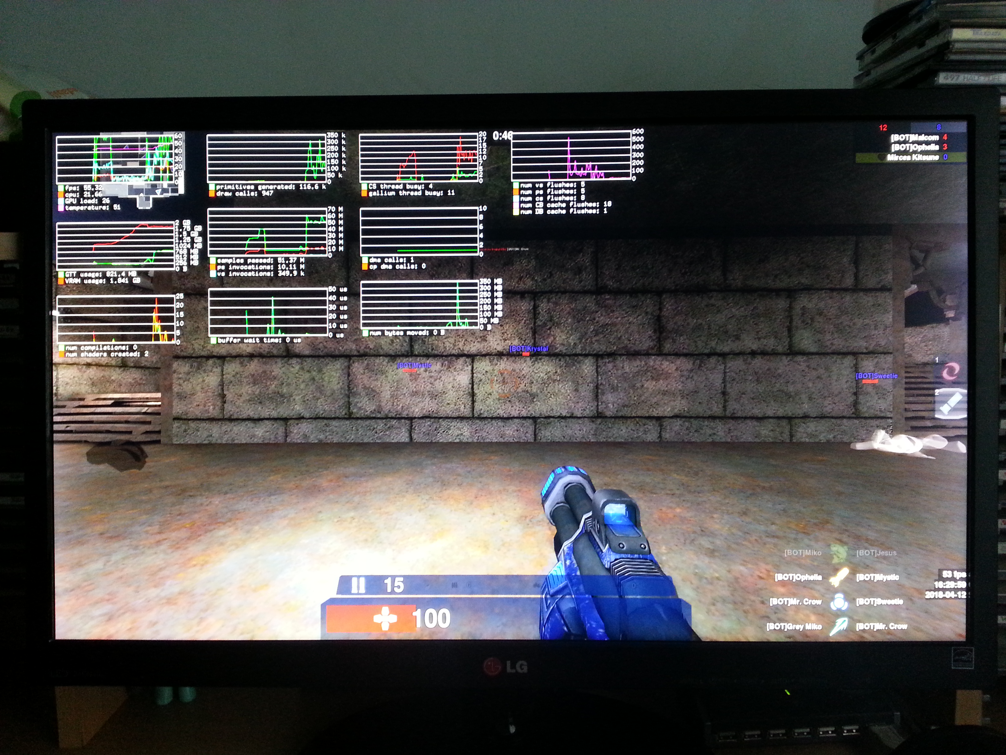 I just finished running the GALLIUM_HUD test, and will be taking a look at the other options next. It was more difficult to test now since the freeze occurs almost instantly after Xonotic loads the map (only a few seconds). I managed to make two photos which I'll attach below: One is the last screenshot I managed to take within the system a few seconds before it froze. The other is a photo of my screen after the freeze has taken place, obviously taken with my phone camera as the computer itself was bricked. A footnote I will add, even if I don't know whether people will even believe me: I had to take those screenshots several times because they kept getting deleted. Whenever I booted the machine back, every screenshot of Xonotic with this HUD was corrupted and turned into a 0 byte file... even ones that were quickly moved to other directories precisely to avoid this, and were also taken by an external process! Other files on my drive are fine, it's only those screenshots... thankfully one survived and it shows all of the graphs and parameters right before the crash. I'm legitimately crept out, as I didn't expect a potential attack program to contain software capable of identifying and deleting evidence of testing, which is the only explanation I can find for what I just saw. I'll do the next tests carefully as I don't know what else may happen to my computer.