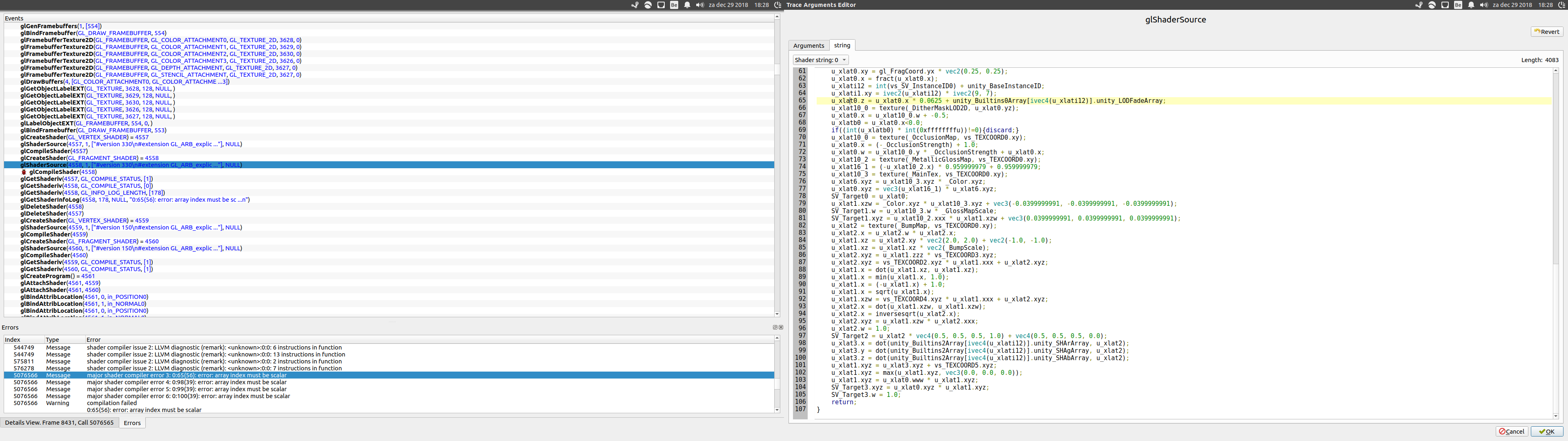 Created attachment 142915 [details] Recurring error in trace file replay in qapitrace I've now installed qapitrace (sudo apt-get install apitrace-gui) and can now look into what errors are being listed after I replay the trace therein. Then I tried delving deeper into the error messages and think I may have at least found something relevant. But I'm quite out of my element here. In the attached screenshot, you can see it lists 4 errors regarding "array index must be a scalar". These errors seem to refer to a glShaderSource call for a GL_FRAGMENT_SHADER, shader string 0, at lines 65,98,99 and 100. What these four lines have in common is that they all use the same value to address a certain index in an array: ivec4(u_xlati12) For line 65 it's unity_Builtins0Array and for 98,99 and 100 it's unity_Builtins0Array. So now the question is, what is the value of ivec4(u_xlati12) and what generates it, to find out what is causing it. The error is repeated quite often, and it's always that index. The fact that I can also see variables named _OcclusionStrength and _OcclusionMap at least makes me think I'm looking in the right direction.