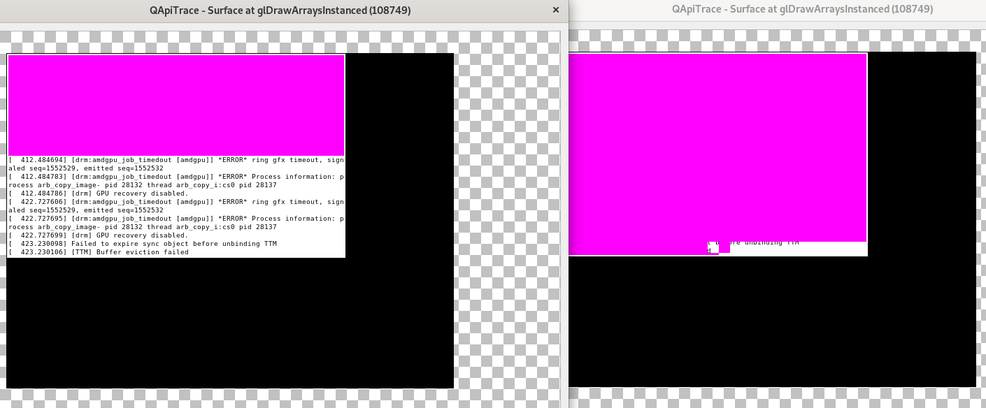 Created attachment 143834 [details] Xephyr.trace Here is an apitrace to reproduce the bug, I used this: export MESA_EXTENSION_OVERRIDE="-GL_ARB_buffer_storage" apitrace trace /usr/bin/Xephyr -glamor :1 -screen 1024x768 As described here: https://github.com/apitrace/apitrace/wiki/Glamor I can replay it with either of those commands: eglretrace -w Xephyr.trace or glretrace -w Xephyr.trace This was iive's suggestion (thanks).