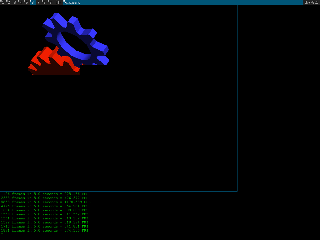 >I have less and less of an idea when this thing happens. My first thought was maybe compositor or 64 vs 32 bit os. I'm using xfwm with compositing turned off. I also changed the CPU in this laptop ;) and I'm using 64 bit os. *-cpu description: CPU product: Intel(R) Core(TM)2 CPU T5500 @ 1.66GHz vendor: Intel Corp. physical id: 4 bus info: cpu@0 slot: U23 size: 1666MHz capacity: 1667MHz width: 64 bits clock: 100MHz capabilities: fpu fpu_exception wp vme de pse tsc msr pae mce cx8 apic sep mtrr pge mca cmov pat pse36 clflush dts acpi mmx fxsr sse sse2 ss ht tm pbe syscall nx x86-64 constant_tsc arch_perfmon pebs bts rep_good nopl cpuid aperfmperf pni dtes64 monitor ds_cpl est tm2 ssse3 cx16 xtpr pdcm lahf_lm pti dtherm cpufreq But after you told us that glxgears "magically" works sometimes for you then I have no idea.