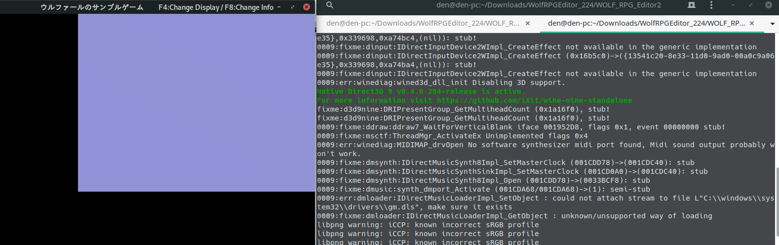 Hi, thanks for the report. Could you please clarify this moment? > 4. Set wined3d renderer to "gdi" [Note: This is a workaround for "black screen" issue in Gallium Nine, e.g. 'wine reg add "HKCU\Software\Wine\Direct3D" /v "Renderer" /t REG_SZ /d "gdi"'] I added this command: [den@den-pc WOLF_RPG_Editor2]$ wine reg add "HKCU\Software\Wine\Direct3D" /v "Renderer" /t REG_SZ /d "gdi" The operation completed successfully but still getting black screen, did I miss something? Full log from game start below: [den@den-pc WOLF_RPG_Editor2]$ wine '/home/den/Downloads/WolfRPGEditor_224/WOLF_RPG_Editor2/Game.exe' 0112:err:module:load_so_dll failed to load .so lib "/usr/bin/../lib32/wine/l3codeca.acm.so": libmpg123.so.0: cannot open shared object file: No such file or directory 0112:fixme:win:RegisterTouchWindow (0xe0054 00000000): stub 0112:fixme:win:WINNLSEnableIME hwnd 0xe0054 enable 0: stub! 0112:fixme:dinput:IDirectInputDevice2WImpl_CreateEffect (0x16bc08)->({13541c23-8e33-11d0-9ad0-00a0c9a06e35},0x339698,0xa74bc4,(nil)): stub! 0112:fixme:dinput:IDirectInputDevice2WImpl_CreateEffect not available in the generic implementation 0112:fixme:dinput:IDirectInputDevice2WImpl_CreateEffect (0x16bc08)->({13541c20-8e33-11d0-9ad0-00a0c9a06e35},0x339698,0xa74ba4,(nil)): stub! 0112:fixme:dinput:IDirectInputDevice2WImpl_CreateEffect not available in the generic implementation 0112:err:winediag:wined3d_dll_init Disabling 3D support. 0112:fixme:ddraw:ddraw7_WaitForVerticalBlank iface 001A0BA0, flags 0x1, event 00000000 stub! 0112:fixme:msctf:ThreadMgr_ActivateEx Unimplemented flags 0x4 0112:err:winediag:MIDIMAP_drvOpen No software synthesizer midi port found, Midi sound output probably won't work. 0112:fixme:dmsynth:IDirectMusicSynth8Impl_SetMasterClock (001CC2A8)->(001CC170): stub 0112:fixme:dmsynth:IDirectMusicSynthSinkImpl_SetMasterClock (001CB668)->(001CC170): stub 0112:fixme:dmsynth:IDirectMusicSynth8Impl_Open (001CC2A8)->(0033BCF8): stub 0112:fixme:dmusic:synth_dmport_Activate (001CBF98/001CBF98)->(1): semi-stub 0112:err:dmloader:IDirectMusicLoaderImpl_SetObject : could not attach stream to file L"C:\\windows\\system32\\drivers\\gm.dls", make sure it exists 0112:fixme:dmloader:IDirectMusicLoaderImpl_GetObject : unknown/unsupported way of loading libpng warning: iCCP: known incorrect sRGB profile libpng warning: iCCP: known incorrect sRGB profile libpng warning: iCCP: known incorrect sRGB profile libpng warning: iCCP: known incorrect sRGB profile upd - after adding that row in "reg" I can't start the game on DX11 now (also added "libmpg123" this package, still - didn't help)