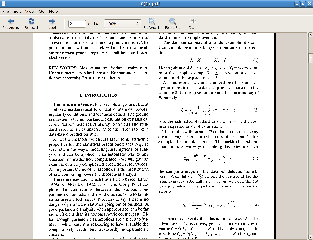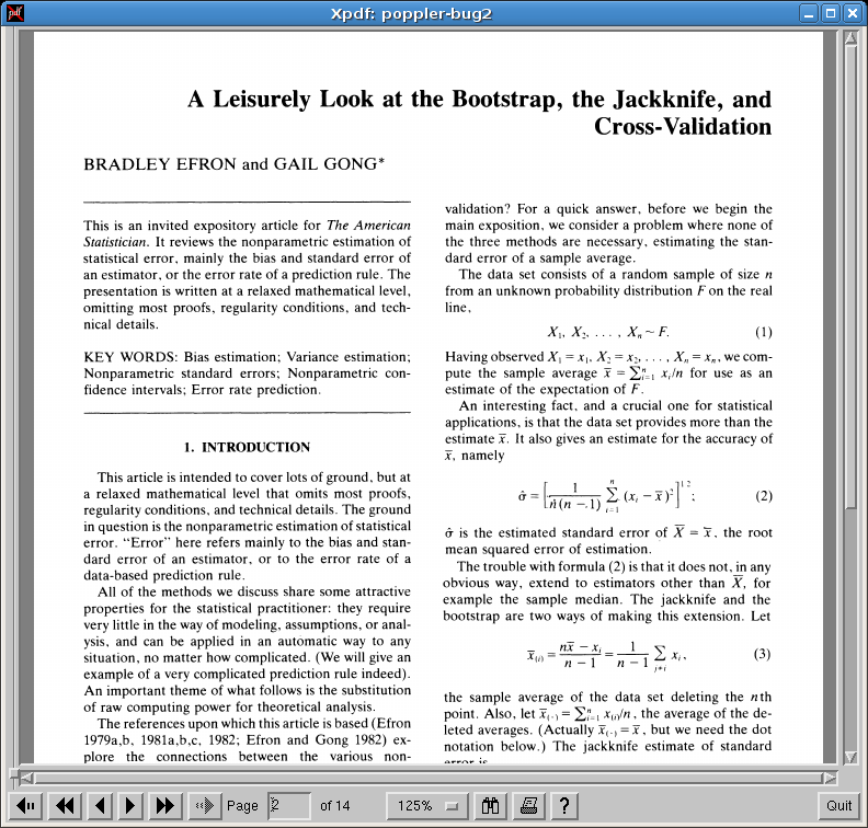 The attached PDF, downloaded from JSTOR, appears to have originally been scanned, and so the text is bitmapped. Evince 0.8.1 using poppler 0.5.4 (cairo backend) renders it very poorly at normal scaling factors, as if it were using a low quality scaler -- the text is essentially unreadable. This is not due to the original scan simply being of too low quality -- if I zoom in far enough in evince the text becomes clear, and if I then use the gimp's bicubic scaler to scale it back down to equivalent size, the text remains readable. It is something evince/poppler's scaling that is failing -- perhaps just using a linear instead of bicubic scaler as a speed optimization, which would be a very poor tradeoff for this document. Similarly, xpdf renders the text entirely readably. Attached files: test.pdf -- look at, say, equation (2) on the second page, and surrounding text evince.png -- screenshot of evince showing this text, very ugly xpdf.png -- screenshot of xpdf showing the same text, perfectly readably evince-then-scaled-down-by-gimp.png -- zooming in in evince, then taking a screenshot and scaling the screenshot back down to equivalent size, results in readable text
