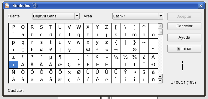 The gliph for capital letter a with a tilde (Á) shows as an inverted admiration sign. I've discover it while trying to write "Ánodo" (anodus in spanish) in Open Office. Also shows wrong when font is embedded as a subset in a PDF document. Others DejaVu fonts set are OK.