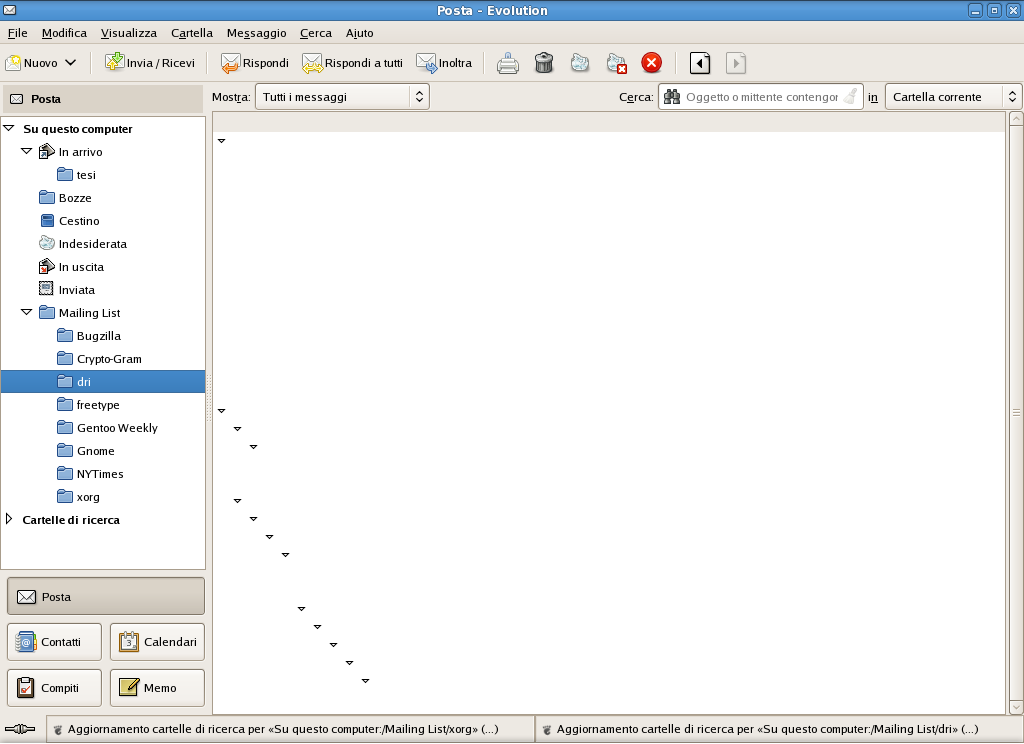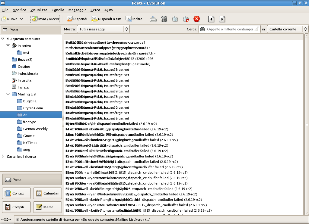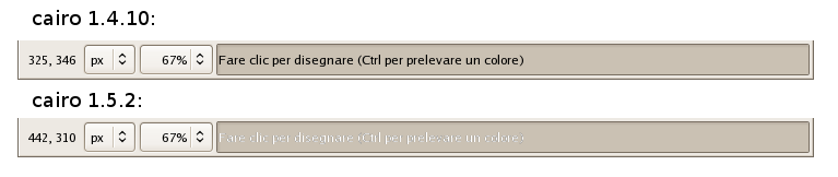 cairo 1.5.2 causes font glitches in the gimp 2.4 status bar. The black antialiased text is replaced by white text. Screenshot follows. It also causes another font-related glitch which could or could not be related, in the message view of evolution 2.12.1. When the program is launched, for a split second the message summaries collapse to the left, then the window's painting ends and everything becomes normal again. Screenshot follows.