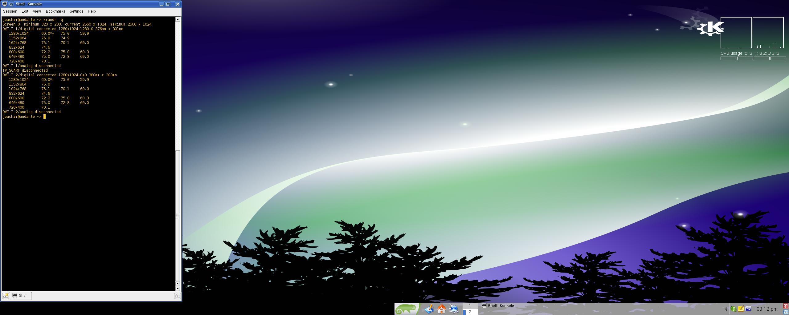 what happens is I start xdm and it is in cloned mode, next I log in and set the dual-head with xrandr which results in the artefacts on the second screen (actually DVI-I_1/digital, but since it is rightmost I call it second). To get rid of the artifacts I kill kwin and start fvwm (twm and openbox don't help only fvwm) then the artifact is gone and I can kill fvwm and go back to kwin all the while there is no new events in xorg.0.log since going from clone to dual-head. This even happens if I have the second screen overlap that means both are 1280x1024 and screen two is now at offest 640x0 then there is that strip of 640x1024 which is rendered correctly on screen 1 but not on screen 2.