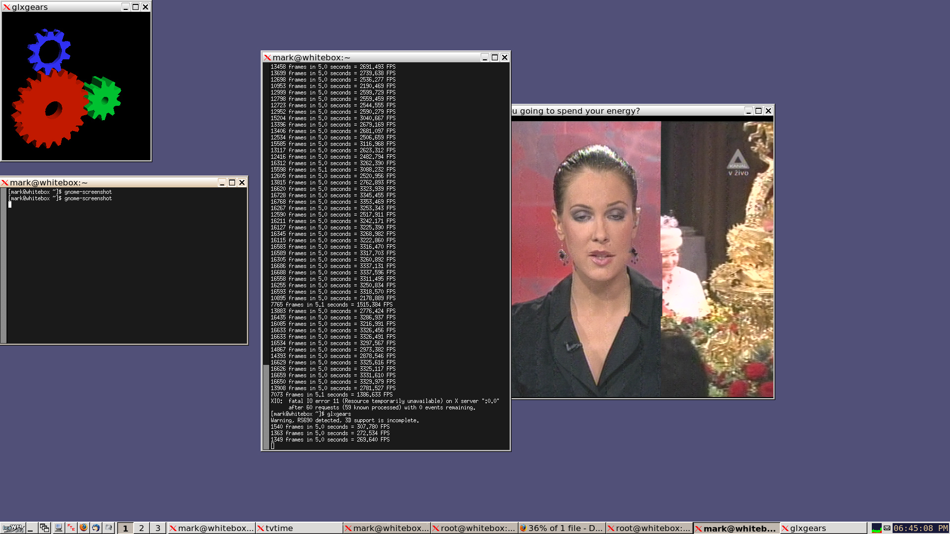 Distro is current rawhide (upgraded from fc8 + current git) I still get random blanking, after killing the usual suspects (dbus, udev, ...) gears is running fullscreen at 17fps, I'm not sure about DRI working, it says: Warning, RS690 detected, 3D support is incomplete. This is my process list, except kernel stuff: root 2333 1 0 18:18 ? 00:00:00 /usr/sbin/sshd xfs 2450 1 0 18:18 ? 00:00:00 xfs -droppriv -daemon root 2577 1 0 18:18 tty4 00:00:00 /sbin/mingetty tty4 root 2578 1 0 18:18 tty5 00:00:00 /sbin/mingetty tty5 root 2579 1 0 18:18 ? 00:00:00 login -- mark root 2580 1 0 18:18 tty3 00:00:00 /sbin/mingetty tty3 root 2581 1 0 18:18 ? 00:00:00 login -- root root 2583 1 0 18:18 tty6 00:00:00 /sbin/mingetty tty6 root 2813 2581 0 18:19 tty1 00:00:00 -bash mark 2857 2579 0 18:20 tty2 00:00:00 -bash mark 2927 2857 0 18:20 tty2 00:00:00 /bin/sh /usr/bin/startx mark 2945 2927 0 18:20 tty2 00:00:00 xinit /etc/X11/xinit/xinitrc -- -auth /home/mark/.serverauth.2927 root 2946 2945 32 18:20 tty7 00:22:06 X :0 -auth /home/mark/.serverauth.2927 mark 2951 2945 0 18:20 ? 00:00:00 icewm-session mark 3110 2951 0 18:20 ? 00:00:00 /usr/bin/ssh-agent /home/mark/.Xclients mark 3159 2951 0 18:20 ? 00:00:04 [xterm] mark 3183 3159 0 18:20 ? 00:00:00 xterm mark 3185 3183 0 18:20 pts/0 00:00:00 bash mark 3241 3159 0 18:21 ? 00:00:01 xterm mark 3243 3241 0 18:21 pts/1 00:00:00 bash root 3530 3243 0 18:26 pts/1 00:00:00 bash mark 3571 3185 1 18:27 pts/0 00:00:56 glxgears mark 3630 3159 0 18:32 ? 00:00:00 /bin/sh /opt/firefox/firefox mark 3633 3630 0 18:32 ? 00:00:00 /bin/sh /opt/firefox/run-mozilla.sh /opt/firefox/firefox-bin mark 3639 3633 8 18:32 ? 00:04:33 /opt/firefox/firefox-bin mark 3713 3159 0 18:36 ? 00:00:00 xterm mark 3715 3713 0 18:36 pts/2 00:00:00 bash mark 3747 1 0 18:36 ? 00:00:00 /usr/libexec/gconfd-2 12 mark 3763 3159 0 18:41 pts/3 00:00:00 bash mark 3815 3763 0 19:01 pts/3 00:00:01 icewm mark 3816 3815 11 19:05 ? 00:02:28 tvtime mark 3817 3815 0 19:12 ? 00:00:00 rxvt mark 3818 3817 0 19:12 pts/4 00:00:00 bash root 3857 3530 5 19:27 pts/1 00:00:00 ps -ef If the system is idle (except for gears/tvtime) , there is almost no blanking, but as soon as I start doing anything, blanking occurs often. Perhaps unrelated: I got this error once in glxgears (I also got this on X550 once, but it locked up immediately there) *********************************WARN_ONCE********************************* File r300_mem.c function r300_mem_alloc line 225 Ran out of GART memory (for 1048576)! Please consider adjusting GARTSize option. ***************************************************************************