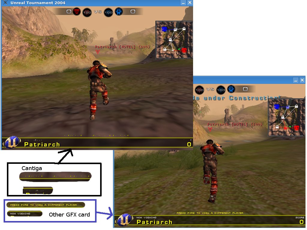 Basic setup: FC8 standard install KDE pull graphics: 4/9/08 git-clone git://anongit.freedesktop.org/git/xorg/driver/xf86-video-intel git-clone git://anongit.freedesktop.org/git/mesa/drm git-clone git://anongit.freedesktop.org/git/mesa/mesa compile and install with kernel 2.6.24.4 +agp patch for Cantiga /usr/.... Two different programs exhibiting in correct graphics from application. In the case of Ut2004 demo the corruption seems to be limited to text and some in game graphics. In the case x2 threat demo there appears to missing textures Unreal tournament can be started with: ./ut2004demo ons-torlan?spectatoronly=true?numbots=14?difficulty=7?quickstart=true?attractcam=true -windowed -benchmark -nosound -1024x768 -seconds=90 X2 started with normal x2-demo then ant-aliasing turned off and auto quality turned off. Launch game play introduction.