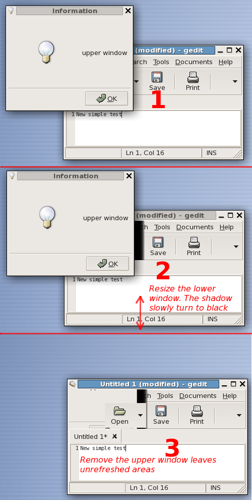 Note: This bug might be be related to #1655, I don't know. When one resize a window coverd by another one, the content of the window placed under is not refreshed correctly. This shows with all compositing manager I know (xcompmgr, xfwm4 and even the Xserver's automatic compositor. More surprising is that the shadows turn to black as the underlying window is resize, like if the XRenderComposite with operation= PictOpOver was performed on a unrefreshed area. I tried hacking xcompmgr to repaint the whole screen in one sigle loop and refreshing the whole screen, did not make any difference.... I looks like the window named pixmap/content is altered.
