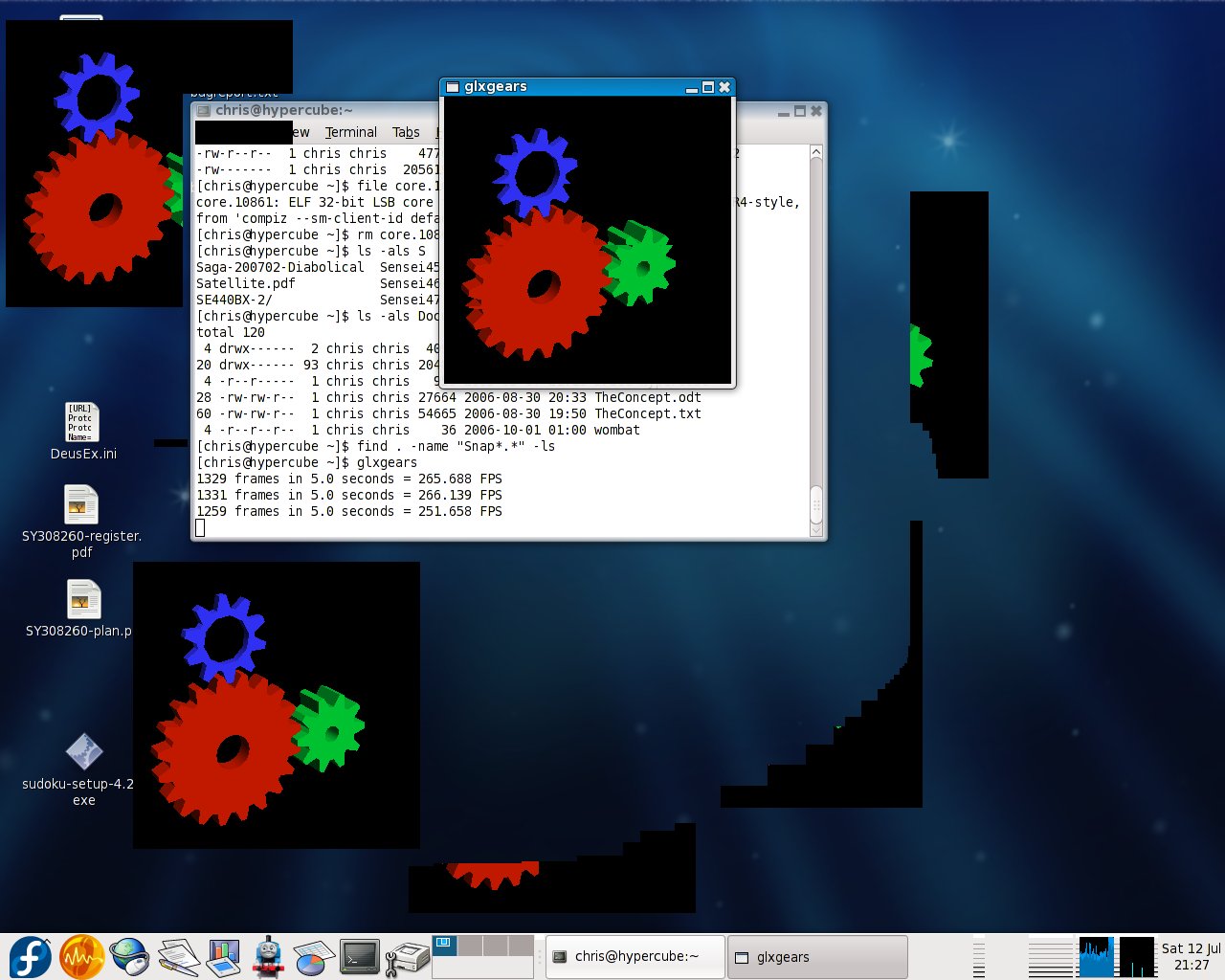 Created attachment 17650 [details] Desktop corruption when enabling Desktop Effects. I enabled Desktop Effects on Fedora 9, ran glxgears and observed the following effect when dragging the glxgears window around the screen (see attachment). The icons on the gnome-panel at the bottom of the screen were also corrupt. I have a Radeon 7000 AGP card, with a 500 MGHz PIII CPU.