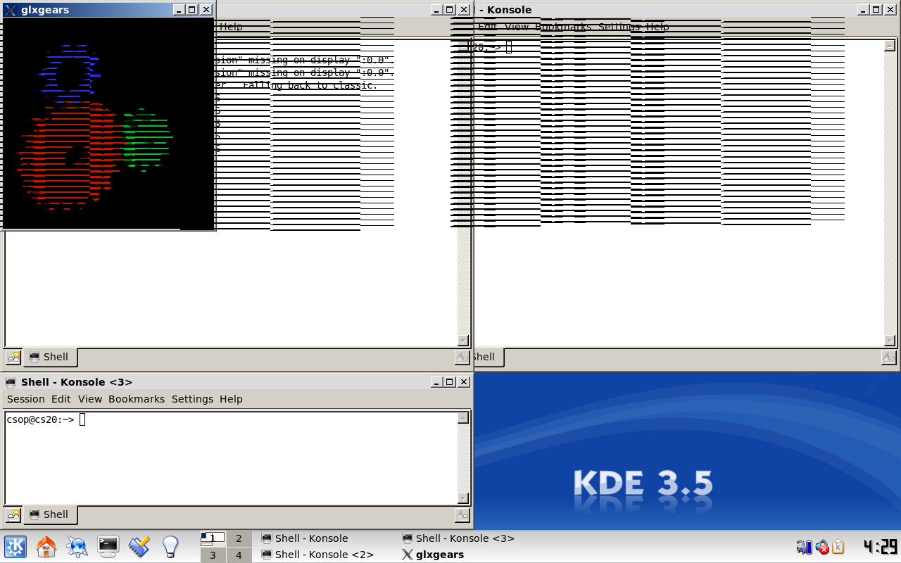 Created attachment 18689 [details] snapshot of running glxgears Setup: 965GM in Dell latitude D830 kernel 2.6.23.17 and drm-modules included therein libdrm-2.3.1 xorg-libs from master (2008-09-04) xorg-server 1.5.0 xf86-video-intel driver 2.4.2