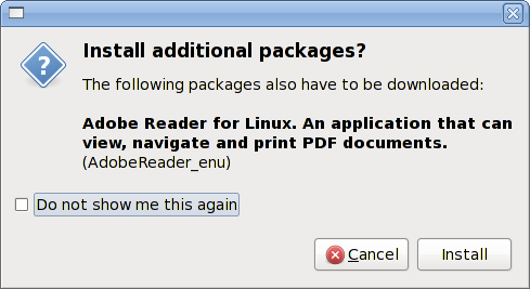Created attachment 19011 [details] PackageKit dialog Very, very often, when I am installing a new package, I get the same dialog which asks if I want to install Adobe Reader too. Of course that itself annoys me since I know I don't need Reader to use a program (plus, I've got Evince), but the problem I'm having is that this comes up for a LOT of the packages I install -- and it keeps coming up. It doesn't seem like Adobe Reader is getting installed at all. What is going on?