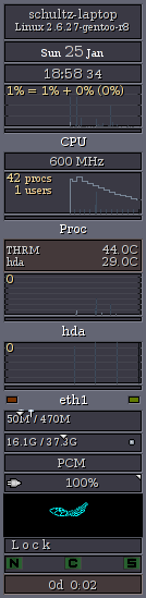 Well, I repeated the test today and got the log. It follows: X Window System Version 1.3.0 Release Date: 19 April 2007 X Protocol Version 11, Revision 0, Release 1.3 Build Operating System: UNKNOWN Current Operating System: Linux schultz-laptop 2.6.25-gentoo-r8 #1 Sat Oct 4 10:42:40 BRT 2008 i686 Build Date: 15 June 2008 Before reporting problems, check http://wiki.x.org to make sure that you have the latest version. Module Loader present Markers: (--) probed, (**) from config file, (==) default setting, (++) from command line, (!!) notice, (II) informational, (WW) warning, (EE) error, (NI) not implemented, (??) unknown. (==) Log file: "/var/log/Xorg.0.log", Time: Tue Oct 14 10:58:46 2008 (==) Using config file: "/etc/X11/xorg.conf" (==) ServerLayout "X.org Configured" (**) |-->Screen "Screen0" (0) (**) | |-->Monitor "Monitor0" (**) | |-->Device "Card0" (**) |-->Input Device "touchpad" (**) |-->Input Device "Keyboard0" (II) No default mouse found, adding one (**) |-->Input Device "<default pointer>" (WW) The directory "/usr/share/fonts/TTF/" does not exist. Entry deleted from font path. (WW) The directory "/usr/share/fonts/OTF" does not exist. Entry deleted from font path. (**) FontPath set to: /usr/share/fonts/misc/, /usr/share/fonts/Type1/, /usr/share/fonts/100dpi/, /usr/share/fonts/75dpi/ (**) RgbPath set to "/usr/share/X11/rgb" (**) ModulePath set to "/usr/lib/xorg/modules" (II) Open ACPI successful (/var/run/acpid.socket) (II) Loader magic: 0x81ee5c0 (II) Module ABI versions: X.Org ANSI C Emulation: 0.3 X.Org Video Driver: 1.2 X.Org XInput driver : 0.7 X.Org Server Extension : 0.3 X.Org Font Renderer : 0.5 (II) Loader running on linux (II) LoadModule: "pcidata" (II) Loading /usr/lib/xorg/modules//libpcidata.so (II) Module pcidata: vendor="X.Org Foundation" compiled for 1.3.0, module version = 1.0.0 ABI class: X.Org Video Driver, version 1.2 (--) using VT number 7 (II) PCI: PCI scan (all values are in hex) (II) PCI: 00:00:0: chip 8086,3580 card 103c,3084 rev 02 class 06,00,00 hdr 80 (II) PCI: 00:00:1: chip 8086,3584 card 103c,3084 rev 02 class 08,80,00 hdr 00 (II) PCI: 00:00:3: chip 8086,3585 card 103c,3084 rev 02 class 08,80,00 hdr 80 (II) PCI: 00:02:0: chip 8086,3582 card 103c,3084 rev 02 class 03,00,00 hdr 80 (II) PCI: 00:02:1: chip 8086,3582 card 103c,3084 rev 02 class 03,80,00 hdr 80 (II) PCI: 00:1d:0: chip 8086,24c2 card 103c,3084 rev 03 class 0c,03,00 hdr 80 (II) PCI: 00:1d:1: chip 8086,24c4 card 103c,3084 rev 03 class 0c,03,00 hdr 00 (II) PCI: 00:1d:2: chip 8086,24c7 card 103c,3084 rev 03 class 0c,03,00 hdr 00 (II) PCI: 00:1d:7: chip 8086,24cd card 103c,3084 rev 03 class 0c,03,20 hdr 00 (II) PCI: 00:1e:0: chip 8086,2448 card 0000,0000 rev 83 class 06,04,00 hdr 01 (II) PCI: 00:1f:0: chip 8086,24cc card 0000,0000 rev 03 class 06,01,00 hdr 80 (II) PCI: 00:1f:1: chip 8086,24ca card 103c,3084 rev 03 class 01,01,8a hdr 00 (II) PCI: 00:1f:3: chip 8086,24c3 card 103c,3084 rev 03 class 0c,05,00 hdr 00 (II) PCI: 00:1f:5: chip 8086,24c5 card 103c,3084 rev 03 class 04,01,00 hdr 00 (II) PCI: 00:1f:6: chip 8086,24c6 card 103c,3084 rev 03 class 07,03,00 hdr 00 (II) PCI: 02:00:0: chip 10ec,8139 card 103c,3084 rev 10 class 02,00,00 hdr 00 (II) PCI: 02:05:0: chip 104c,ac50 card 3400,0000 rev 02 class 06,07,00 hdr 02 (II) PCI: 02:06:0: chip 8086,4220 card 103c,12f5 rev 05 class 02,80,00 hdr 00 (II) PCI: 02:07:0: chip 104c,8026 card 103c,3084 rev 00 class 0c,00,10 hdr 00 (II) PCI: End of PCI scan (II) Intel Bridge workaround enabled (II) Host-to-PCI bridge: (II) Bus 0: bridge is at (0:0:0), (0,0,3), BCTRL: 0x0008 (VGA_EN is set) (II) Bus 0 I/O range: [0] -1 0 0x00000000 - 0x0000ffff (0x10000) IX[B] (II) Bus 0 non-prefetchable memory range: [0] -1 0 0x00000000 - 0xffffffff (0x0) MX[B] (II) Bus 0 prefetchable memory range: [0] -1 0 0x00000000 - 0xffffffff (0x0) MX[B] (II) Subtractive PCI-to-PCI bridge: (II) Bus 2: bridge is at (0:30:0), (0,2,6), BCTRL: 0x0000 (VGA_EN is cleared) (II) Bus 2 I/O range: [0] -1 0 0x00003000 - 0x00003fff (0x1000) IX[B] (II) Bus 2 non-prefetchable memory range: [0] -1 0 0xe0200000 - 0xe02fffff (0x100000) MX[B] (II) Bus 2 prefetchable memory range: [0] -1 0 0x30000000 - 0x33ffffff (0x4000000) MX[B] (II) PCI-to-ISA bridge: (II) Bus -1: bridge is at (0:31:0), (0,-1,-1), BCTRL: 0x0008 (VGA_EN is set) (II) PCI-to-CardBus bridge: (II) Bus 3: bridge is at (2:5:0), (2,3,6), BCTRL: 0x05c0 (VGA_EN is cleared) (II) Bus 3 I/O range: [0] -1 0 0x00003400 - 0x000034ff (0x100) IX[B] [1] -1 0 0x00003800 - 0x000038ff (0x100) IX[B] (II) Bus 3 prefetchable memory range: [0] -1 0 0x30000000 - 0x33ffffff (0x4000000) MX[B] (--) PCI:*(0:2:0) Intel Corporation 82852/855GM Integrated Graphics Device rev 2, Mem @ 0xe8000000/27, 0xe0000000/19, I/O @ 0x1800/3 (--) PCI: (0:2:1) Intel Corporation 82852/855GM Integrated Graphics Device rev 2, Mem @ 0xf0000000/27, 0xe0080000/19 (II) Addressable bus resource ranges are [0] -1 0 0x00000000 - 0xffffffff (0x0) MX[B] [1] -1 0 0x00000000 - 0x0000ffff (0x10000) IX[B] (II) OS-reported resource ranges: [0] -1 0 0x00100000 - 0x3fffffff (0x3ff00000) MX[B]E(B) [1] -1 0 0x000f0000 - 0x000fffff (0x10000) MX[B] [2] -1 0 0x000c0000 - 0x000effff (0x30000) MX[B] [3] -1 0 0x00000000 - 0x0009ffff (0xa0000) MX[B] [4] -1 0 0x0000ffff - 0x0000ffff (0x1) IX[B] [5] -1 0 0x00000000 - 0x000000ff (0x100) IX[B] (II) Active PCI resource ranges: [0] -1 0 0xe0200000 - 0xe0203fff (0x4000) MX[B] [1] -1 0 0xe0205000 - 0xe02057ff (0x800) MX[B] [2] -1 0 0xe0204000 - 0xe0204fff (0x1000) MX[B] [3] -1 0 0xe0205800 - 0xe02058ff (0x100) MX[B] [4] -1 0 0xe0100800 - 0xe01008ff (0x100) MX[B] [5] -1 0 0xe0100c00 - 0xe0100dff (0x200) MX[B] [6] -1 0 0x34000000 - 0x340003ff (0x400) MX[B] [7] -1 0 0xe0100000 - 0xe01003ff (0x400) MX[B] [8] -1 0 0xe0080000 - 0xe00fffff (0x80000) MX[B](B) [9] -1 0 0xf0000000 - 0xf7ffffff (0x8000000) MX[B](B) [10] -1 0 0xe0000000 - 0xe007ffff (0x80000) MX[B](B) [11] -1 0 0xe8000000 - 0xefffffff (0x8000000) MX[B](B) [12] -1 0 0x00003000 - 0x000030ff (0x100) IX[B] [13] -1 0
