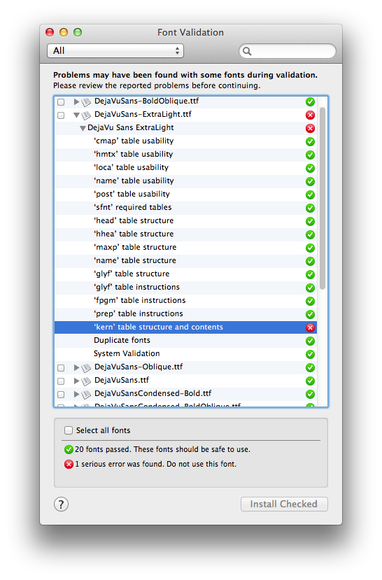 MacOSX Font importer (Schriftensammlung) reports DejaVuSans-ExtraLight structure and content of "kern"-Table is bad Seems to be this bug, on MacOS 10.8.5 and DejaVu version 2.34.