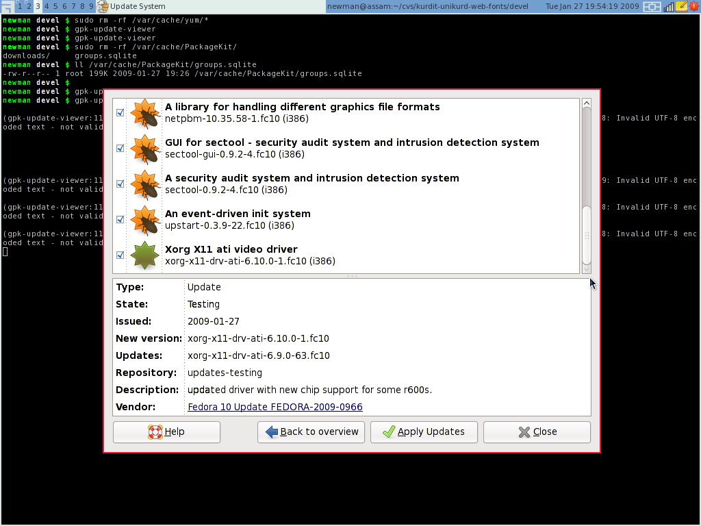 Created attachment 22307 [details] Info about UpdatedPackage1 is displayer but the UpdatedPackage1 is not selected in the list With gpk-update-viewer happens two weird situations: 1) Some times when freshly started from gpk-update-icon -> "Review" it shows mixed info. I failed to find reproducer for this but the situation is like this. When the review is shown the info frame shows mixed information of the first and list item on the list. E.g.: the "Type" is "Security", and "New version" is "xorg-x11-drv-ati-*", but: The "Type" is from Dia security update, which is first in the list, and the "New version" is from the last "*ati*" update (Enhancement). 2) After fresh start it shows info about the "*ati*" update but none of the items in the list is selected, perhaps it should show nothing (not even the info frame), or on every start pre-select the first in the list. (1) and (2) might be connect each other. gnome-packagekit-0.3.13-1.fc10.i386