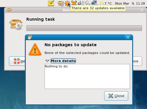 Created attachment 23686 [details] All-in-one img See the screenshot. gnome-update-icon reports 32 packages available for an update but zero is available. Then I opened gpk-update-viewer and it correctly reports zero available, so I selected "Update System Now" and it just reported 'Sorry no updates...'. I remember I did today an update via PackageKit which contained exactly 32 packages... (And, BTW, ``yum'' says: no updates available.) Rawhide: gnome-packagekit-0.4.4-3.fc11.x86_64