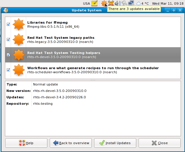 (In reply to comment #8) > If you change DefaultBackend to "dummy" in PackageKit.conf, can you find a way > to reliably reproduce this, or is it limited to the yum backend? Not reproducible. Usually when I know there are updates available *and* the icon is not present in bar I open, manually, gpk-u-v{,2}, it does some necessary magic and the icon is there and I can track the problem. But now the icon won't emerge, so, I am not able to track it. (Side note: a little bit odd is that gpk-u-v2 installed all the "updates" even though I selected only `powertop' there. > If you can't reproduce with the dummy backend, can you try doing (as root): > > NETWORK=TRUE /usr/share/PackageKit/helpers/yum/yumBackend.py ...and I still had the "dummy" set up, in case it's important. > ... > and check that the package you just installed isn't in that list. If it's still > there, it's a yum bug. You'll have to type the commands pretty quick, as the > backend will exit after a few seconds of idle. Thanks. I installed update "rpmfusion-free-release" this way and it was not in the output after command `get-updates\tnone\n' -- Strange is that, every other attempt to install this way a pkg (like rpmfusion-nonfree-release from the same repo) ended this way: update-packages rpmfusion-nonfree-release allow-cancel false percentage 0 status running status dep-resolve percentage 5 allow-cancel true percentage 10 status download percentage 40 status sig-check subpercentage 0 percentage 12610 subpercentage 100 percentage 12640 Importing GPG key 0xB1981B68 "RPM Fusion repository (Fedora - nonfree) <rpmfusion-buildsys@lists.rpmfusion.org>" from /etc/pki/rpm-gpg/RPM-GPG-KEY-rpmfusion-nonfree-fedora repo-signature-required rpmfusion-nonfree-release;10.90-2;noarch;rpmfusion-nonfree-rawhide rpmfusion-nonfree-rawhide /etc/pki/rpm-gpg/RPM-GPG-KEY-rpmfusion-nonfree-fedora RPM Fusion repository (Fedora - nonfree) <rpmfusion-buildsys@lists.rpmfusion.org> B1981B68 1cf26645c90e3a34d5186273206f8182b1981b68 Sat Jul 12 18:40:37 2008 gpg error gpg-failure GPG key B1981B68 required finished But that might be a separate issue.