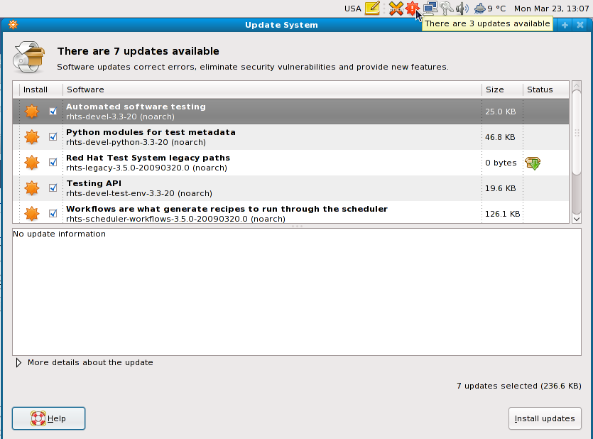 hi, I think I've come across the same problem. I just installed something using yum, and the packagekit applet showed 13 updates. I did a "yum update"successfully. The packagekit applet still shows 13 packages available for update. Clicking it gives > "getting information" > dialogue box pops up: "All software is up to date" [Ankur@localhost threadv1.0]$ rpm -q gnome-packagekit gnome-packagekit-2.30.2-1.fc13.x86_64 ran: [root@localhost ~]# pkcon refresh Refreshing cache [=========================] Waiting for authentication [=========================] Starting [=========================] Refreshing software list [=========================] Generating package lists [=========================] applet still shows 13 updates as available. regards, Ankur Output info from the update:: yum history info $latestHistory Loaded plugins: auto-update-debuginfo, fastestmirror, presto, protectbase, : refresh-packagekit Transaction ID : 157 Begin time : Thu Jul 8 14:15:29 2010 Begin rpmdb : 2336:ef2161a932b44ea79783fb3c045a94be43915ff2 End time : 14:19:00 2010 (211 seconds) End rpmdb : 2337:4d7f4bcab6e1aae100b89d5ad7b9215609a6b1f7 User : Ankur Sinha <Ankur> Return-Code : Success Transaction performed with: Updated rpm-4.8.1-1.fc13.x86_64 Installed yum-3.2.27-4.fc13.noarch Installed yum-metadata-parser-1.1.4-1.fc13.x86_64 Installed yum-plugin-auto-update-debug-info-1.1.27-2.fc13.noarch Installed yum-plugin-fastestmirror-1.1.27-2.fc13.noarch Installed yum-presto-0.6.2-1.fc13.noarch Packages Altered: Updated PackageKit-0.6.5-1.fc13.x86_64 Update 0.6.6-1.fc13.x86_64 Updated PackageKit-command-not-found-0.6.5-1.fc13.x86_64 Update 0.6.6-1.fc13.x86_64 Updated PackageKit-debuginfo-0.6.5-1.fc13.x86_64 Update 0.6.6-1.fc13.x86_64 Updated PackageKit-device-rebind-0.6.5-1.fc13.x86_64 Update 0.6.6-1.fc13.x86_64 Updated PackageKit-glib-0.6.5-1.fc13.x86_64 Update 0.6.6-1.fc13.x86_64 Updated PackageKit-gstreamer-plugin-0.6.5-1.fc13.x86_64 Update 0.6.6-1.fc13.x86_64 Updated PackageKit-gtk-module-0.6.5-1.fc13.x86_64 Update 0.6.6-1.fc13.x86_64 Updated PackageKit-yum-0.6.5-1.fc13.x86_64 Update 0.6.6-1.fc13.x86_64 Updated PackageKit-yum-plugin-0.6.5-1.fc13.x86_64 Update 0.6.6-1.fc13.x86_64 Updated bind-libs-32:9.7.0-10.P2.fc13.x86_64 Update 32:9.7.1-1.fc13.x86_64 Updated bind-utils-32:9.7.0-10.P2.fc13.x86_64 Update 32:9.7.1-1.fc13.x86_64 Updated desktop-effects-0.8.6-1.fc13.x86_64 Update 0.8.7-2.fc13.x86_64 Updated file-5.04-4.fc13.x86_64 Update 5.04-5.fc13.x86_64 Updated file-devel-5.04-4.fc13.x86_64 Update 5.04-5.fc13.x86_64 Updated file-libs-5.04-4.fc13.x86_64 Update 5.04-5.fc13.x86_64 Updated git-1.7.1-1.fc13.x86_64 Update 1.7.1.1-1.fc13.x86_64 Updated groff-1.18.1.4-21.fc13.x86_64 Update 1.18.1.4-22.fc13.x86_64 Updated ibus-rawcode-1.3.0.20100421-2.fc13.x86_64 Update 1.3.1.20100707-1.fc13.x86_64 Updated jwhois-4.0-19.fc13.x86_64 Update 4.0-20.fc13.x86_64 Updated libcollection-0.4.0-12.fc13.x86_64 Update 0.4.0-15.fc13.x86_64 Updated libdhash-0.4.0-12.fc13.x86_64 Update 0.4.0-15.fc13.x86_64 Updated libdrm-2.4.20-1.fc13.i686 Updated libdrm-2.4.20-1.fc13.x86_64 Update 2.4.21-2.fc13.i686 Update 2.4.21-2.fc13.x86_64 Updated libdrm-debuginfo-2.4.20-1.fc13.x86_64 Update 2.4.21-2.fc13.x86_64 Updated libdrm-devel-2.4.20-1.fc13.x86_64 Update 2.4.21-2.fc13.x86_64 Updated libini_config-0.5.0-12.fc13.x86_64 Update 0.5.0-15.fc13.x86_64 Updated libvpx-0.9.0-5.fc13.x86_64 Update 0.9.1-2.fc13.x86_64 Updated m17n-db-1.5.5-3.fc13.noarch Update 1.5.5-4.fc13.noarch Updated m17n-db-assamese-1.5.5-3.fc13.noarch Update 1.5.5-4.fc13.noarch Updated m17n-db-bengali-1.5.5-3.fc13.noarch Update 1.5.5-4.fc13.noarch Updated m17n-db-gujarati-1.5.5-3.fc13.noarch Update 1.5.5-4.fc13.noarch Updated m17n-db-hindi-1.5.5-3.fc13.noarch Update 1.5.5-4.fc13.noarch Updated m17n-db-kannada-1.5.5-3.fc13.noarch Update 1.5.5-4.fc13.noarch Updated m17n-db-malayalam-1.5.5-3.fc13.noarch Update 1.5.5-4.fc13.noarch Updated m17n-db-oriya-1.5.5-3.fc13.noarch Update 1.5.5-4.fc13.noarch Updated m17n-db-punjabi-1.5.5-3.fc13.noarch Update 1.5.5-4.fc13.noarch Updated m17n-db-sinhala-1.5.5-3.fc13.noarch Update 1.5.5-4.fc13.noarch Updated m17n-db-tamil-1.5.5-3.fc13.noarch Update 1.5.5-4.fc13.noarch Updated m17n-db-telugu-1.5.5-3.fc13.noarch Update 1.5.5-4.fc13.noarch Updated m17n-db-thai-1.5.5-3.fc13.noarch Update 1.5.5-4.fc13.noarch Updated m17n-lib-1.5.5-2.fc13.x86_64 Update 1.5.5-3.fc13.x86_64 Updated net-snmp-1:5.5-12.fc13.x86_64 Update 1:5.5-13.fc13.x86_64 Updated net-snmp-libs-1:5.5-12.fc13.x86_64 Update 1:5.5-13.fc13.x86_64 Updated perl-Git-1.7.1-1.fc13.noarch Update 1.7.1.1-1.fc13.noarch Updated python-beaker-1.5.3-1.fc13.noarch Update 1.5.3-3.fc13.noarch Updated python-magic-5.04-4.fc13.x86_64 Update 5.04-5.fc13.x86_64 Updated python-mako-0.3.2-1.fc13.noarch Update 0.3.4-1.fc13.noarch Dep-Install python-markupsafe-0.9.2-3.fc13.x86_64 Updated python-simplejson-2.0.9-3.fc12.x86_64 Update 2.1.1-1.fc13.x86_64 Updated rpm-4.8.1-1.fc13.x86_64 Update 4.8.1-2.fc13.x86_64 Updated rpm-build-4.8.1-1.fc13.x86_64 Update 4.8.1-2.fc13.x86_64 Updated rpm-devel-4.8.1-1.fc13.x86_64 Update 4.8.1-2.fc13.x86_64 Updated rpm-libs-4.8.1-1.fc13.x86_64 Update 4.8.1-2.fc13.x86_64 Updated rpm-python-4.8.1-1.fc13.x86_64 Update 4.8.1-2.fc13.x86_64 Updated sssd-1.2.0-12.fc13.x86_64 Update 1.2.1-15.fc13.x86_64 Updated sssd-client-1.2.0-12.fc13.x86_64 Update 1.2.1-15.fc13.x86_64 Updated tcp_wrappers-7.6-58.fc13.x86_64 Update 7.6-59.fc13.x86_64 Updated tcp_wrappers-libs-7.6-58.fc13.i686 Updated tcp_wrappers-libs-7.6-58.fc13.x86_64 Update 7.6-59.fc13.i686 Update 7.6-59.fc13.x86_64 Scriptlet output: 1 warning: /etc/sssd/sssd.conf created as /etc/sssd/sssd.conf.rpmnew 2 history info