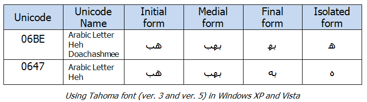 "Arabic Letter Heh Doachashmee (U06BE)" has 4 forms. "Initial and isolated" forms are the same and "medial and final" are same. Now Kurdish people are using "Arabic letter Heh (U0647)"+"Zero width joiner" in isolated and final forms of "H letter of Kurdish". And if we forget the "Zero width joiner", "Kurdish H" looks like "Kurdish E".