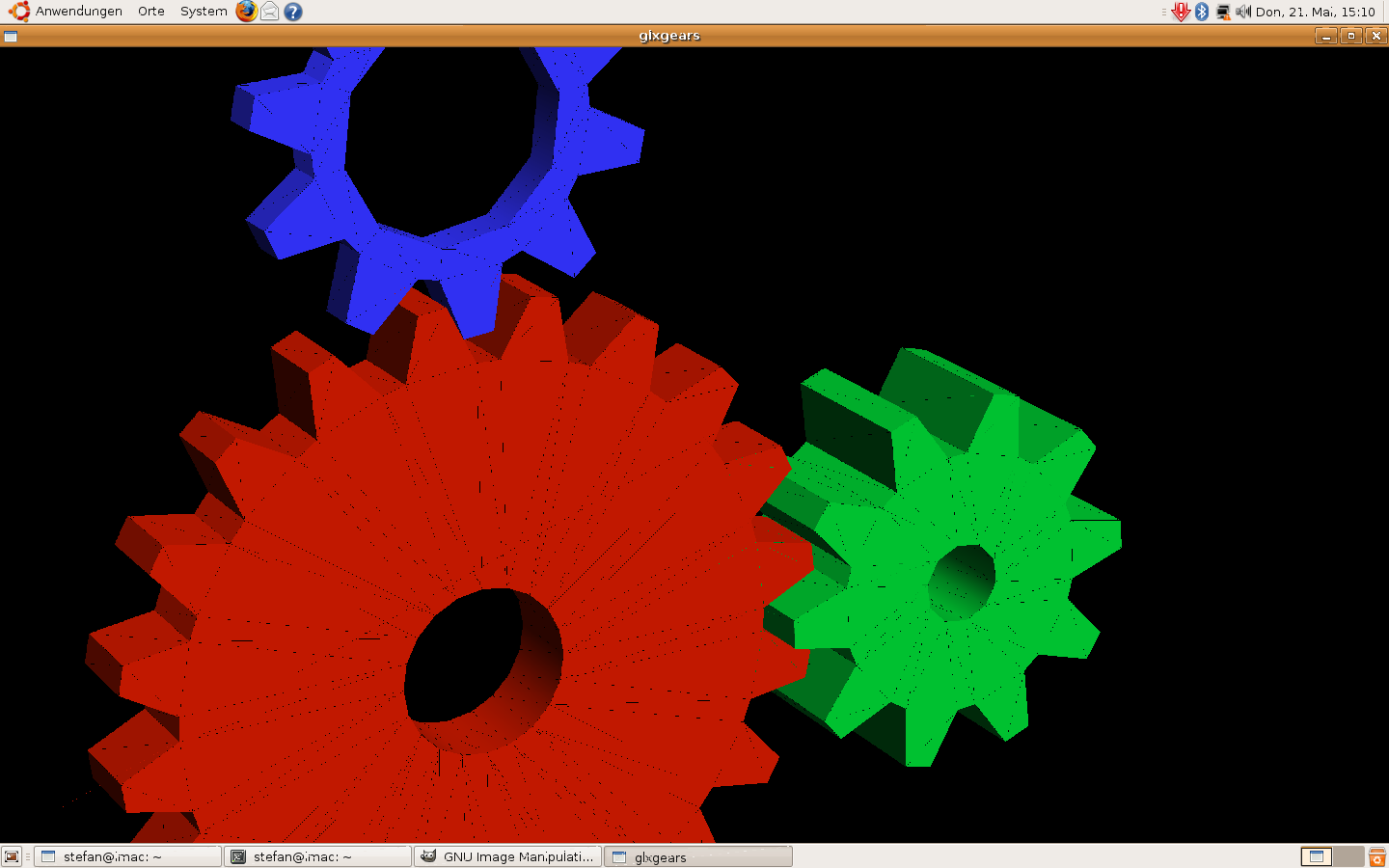 Created attachment 26067 [details] glxgears screenshot This is a screenshot of glxgears. Some 2D GUI elements are also visible. Compiz was disabled. If you look carefully, you can see the diagonal lines in the GUI elements of the top and bottom menu bar.