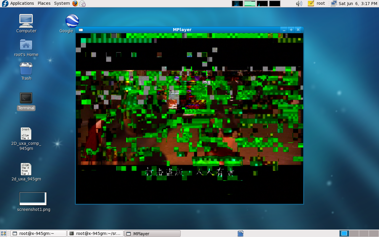 It's not been fixed completely, In our test machine, mplayer can play DVD quality(720x576) videos now, but still could not play videos with higher quality(like 720p or 1080p). The output of mplayer is: [root@x-945gm HDTV]# mplayer -vo xvmc -vc ffmpeg12mc abc.mpg MPlayer 1.0rc2-4.3.0 (C) 2000-2007 MPlayer Team CPU: Genuine Intel(R) CPU T1300 @ 1.66GHz (Family: 6, Model: 14, Stepping: 8) CPUflags: MMX: 1 MMX2: 1 3DNow: 0 3DNow2: 0 SSE: 1 SSE2: 1 Compiled for x86 CPU with extensions: MMX MMX2 SSE SSE2 Playing abc.mpg. TS file format detected. VIDEO MPEG2(pid=33) AUDIO MPA(pid=36) NO SUBS (yet)! PROGRAM N. 2 VIDEO: MPEG2 1280x720 (aspect 3) 59.940 fps 45000.0 kbps (5625.0 kbyte/s) vo_xvmc: X-Video extension 2.2 vo_xvmc: X-Video MotionCompensation Extension version 1.1 ========================================================================== Forced video codec: ffmpeg12mc Opening video decoder: [ffmpeg] FFmpeg's libavcodec codec family [VD_FFMPEG] XVMC accelerated codec. Selected video codec: [ffmpeg12mc] vfm: ffmpeg (FFmpeg MPEG-1/2 (XvMC)) ========================================================================== ========================================================================== Opening audio decoder: [mp3lib] MPEG layer-2, layer-3 AUDIO: 48000 Hz, 2 ch, s16le, 192.0 kbit/12.50% (ratio: 24000->192000) Selected audio codec: [mp3] afm: mp3lib (mp3lib MPEG layer-2, layer-3) ========================================================================== AO: [oss] 48000Hz 2ch s16le (2 bytes per sample) Starting playback... [VD_FFMPEG] XVMC-accelerated MPEG-2. [VD_FFMPEG] Trying pixfmt=0. VDec: vo config request - 1280 x 720 (preferred colorspace: MPEG1/2 Motion Compensation and IDCT) VDec: using MPEG1/2 Motion Compensation as output csp (no 2) Movie-Aspect is 1.78:1 - prescaling to correct movie aspect. VO: [xvmc] 1280x720 => 1280x720 MPEG1/2 Motion Compensation vo_xvmc: Could not find free matching surface. Sorry. FATAL: Cannot initialize video driver. [VD_FFMPEG] Trying pixfmt=1. VDec: vo config request - 1280 x 720 (preferred colorspace: MPEG1/2 Motion Compensation) VDec: using MPEG1/2 Motion Compensation as output csp (no 2) Movie-Aspect is 1.78:1 - prescaling to correct movie aspect. VO: [xvmc] 1280x720 => 1280x720 MPEG1/2 Motion Compensation vo_xvmc: Could not find free matching surface. Sorry. FATAL: Cannot initialize video driver. VDec: vo config request - 1280 x 720 (preferred colorspace: MPEG1/2 Motion Compensation and IDCT) VDec: using MPEG1/2 Motion Compensation as output csp (no 2) Movie-Aspect is 1.78:1 - prescaling to correct movie aspect. VO: [xvmc] 1280x720 => 1280x720 MPEG1/2 Motion Compensation vo_xvmc: Could not find free matching surface. Sorry. FATAL: Cannot initialize video driver. [VD_FFMPEG] Unexpected init_vo error.